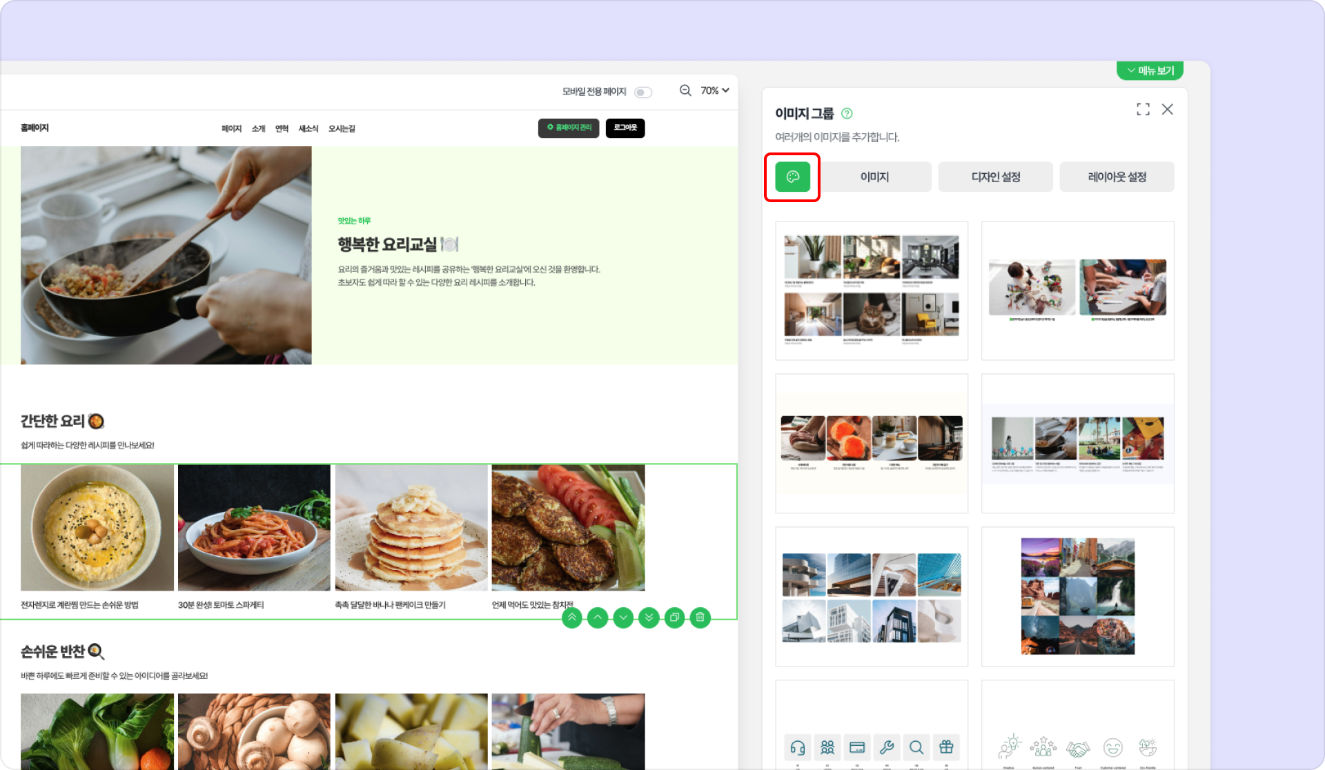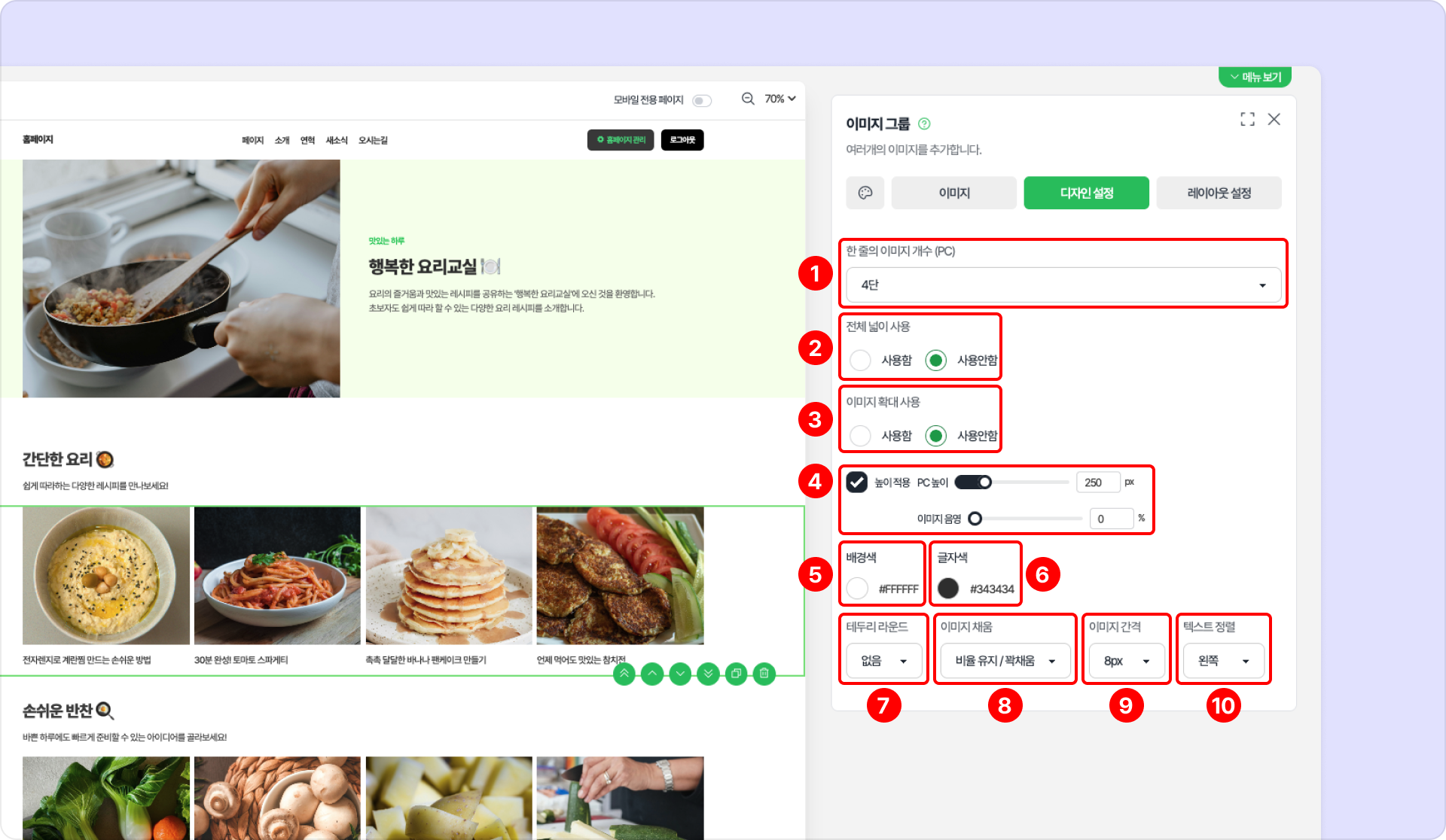 ❶ 한 줄 이미지 개수: 한 줄에 출력될 이미지 개수를 선택합니다. 2단부터 6단까지 설정 가능합니다.