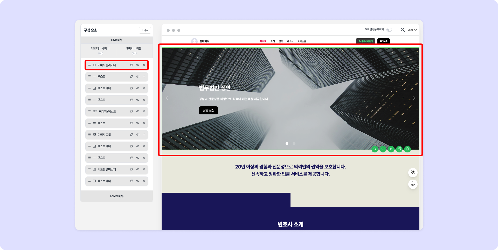 ❼ 이미지 네비게이션: 페이지네이션 '사용'을 선택할 경우 이용할 수 있습니다. 이미지 네비게이션을 '사용'할 경우 슬라이더 하단에 추가한 이미지 리스트가 갤러리 형태로 노출됩니다.