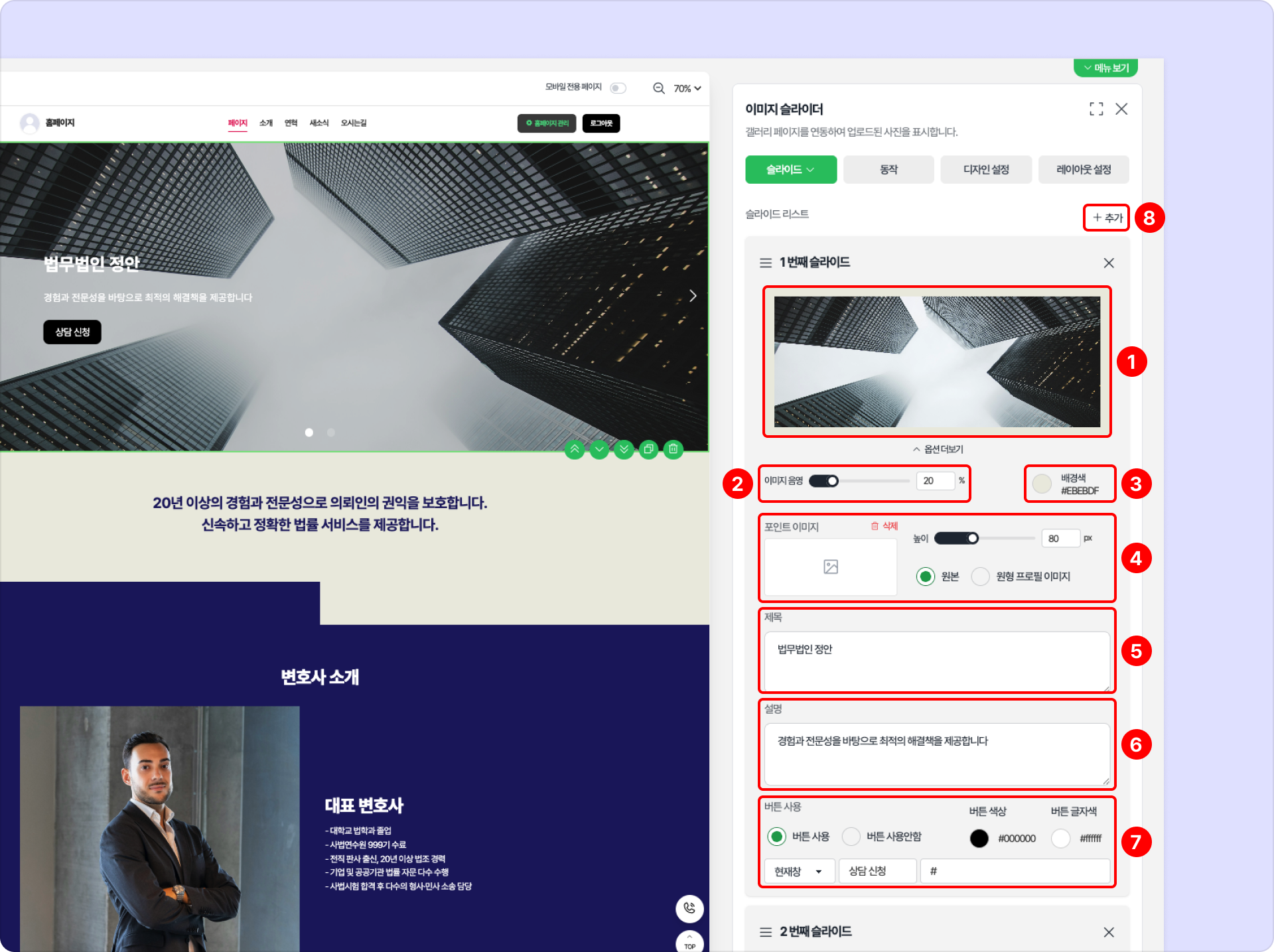 ❶ 이미지 첨부: 영역을 클릭하여 슬라이드로 노출할 이미지를 업로드합니다.
