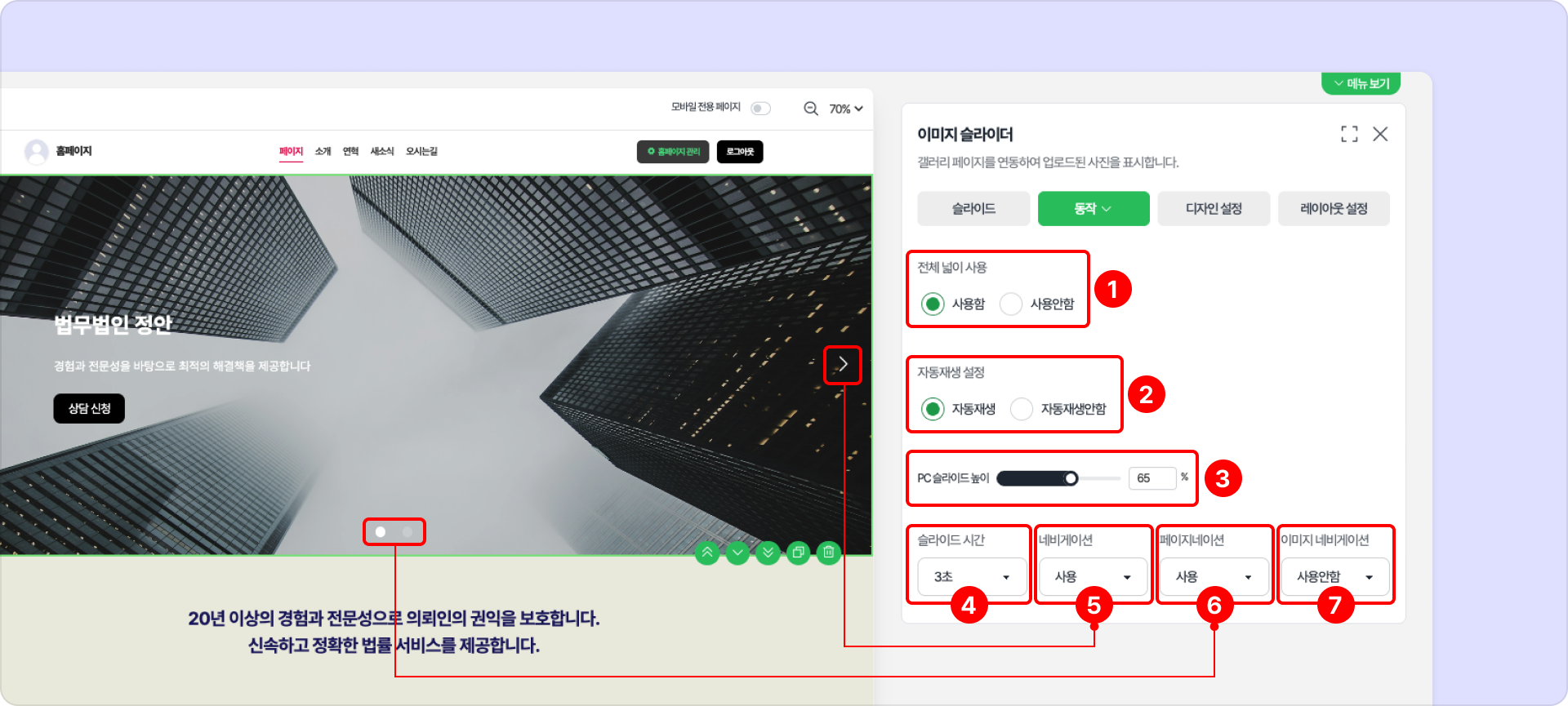 ❻ 페이지네이션: 등록한 이미지 수 만큼 중앙 하단에 원형 버튼이 나타납니다. '사용안함'을 선택할 경우 보여지지 않습니다.