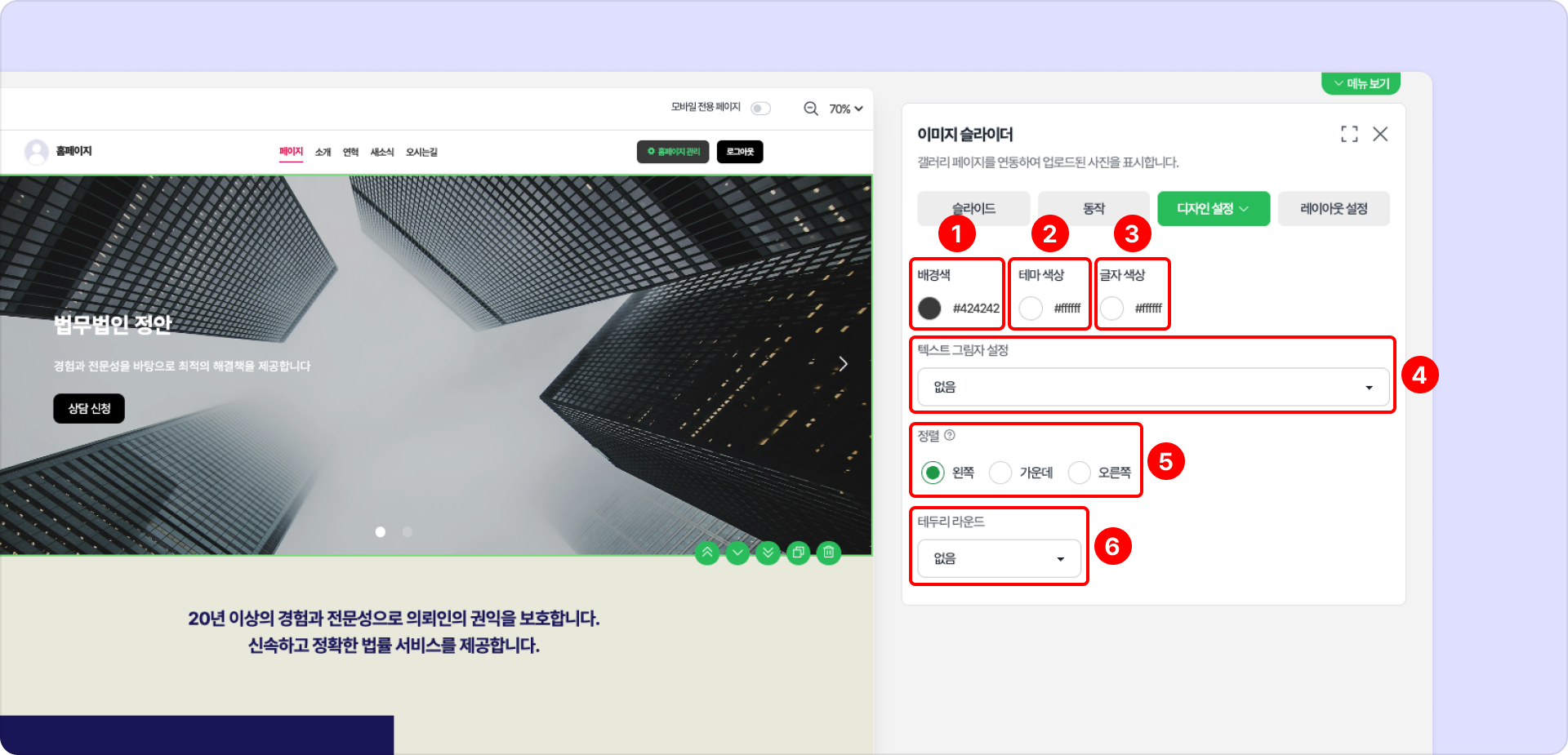 ❶ 배경색: 이미지 슬라이더 뒤 배경색을 설정할 수 있습니다.