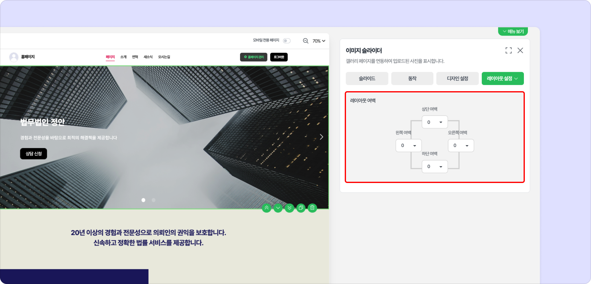 이미지 슬라이더 구성 요소의 위, 아래, 왼쪽, 오른쪽 여백을 각각 설정할 수 있습니다.