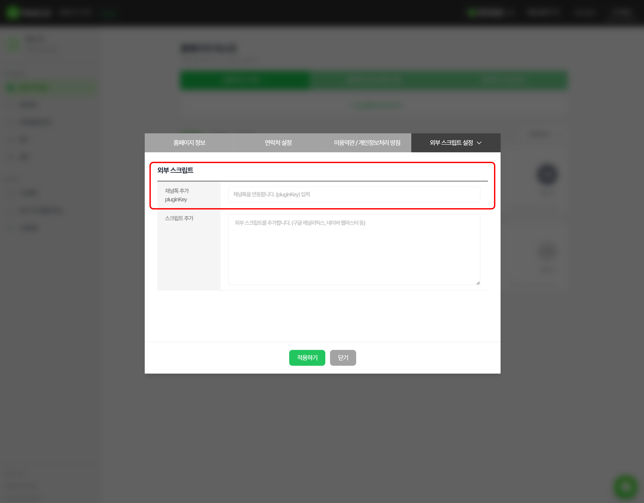 채널톡을 연동할 홈페이지의 정보 수정 > 외부 스크립트 설정 > 채널톡 추가에서 플러그인 키를 삽입해 채널톡을 연동할 수 있어요.