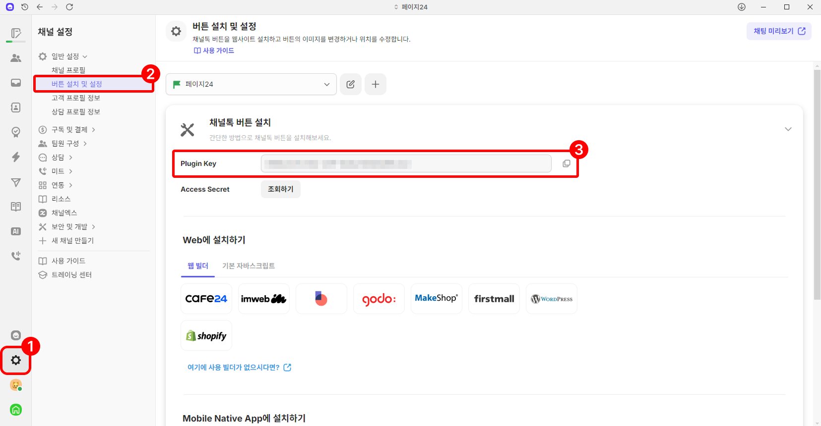 좌측 하단의 채널 설정 > 일반 설정 > 버튼 설치 및 설정 > 채널톡 버튼 설치에서 플러그인 키를 얻을 수 있어요.