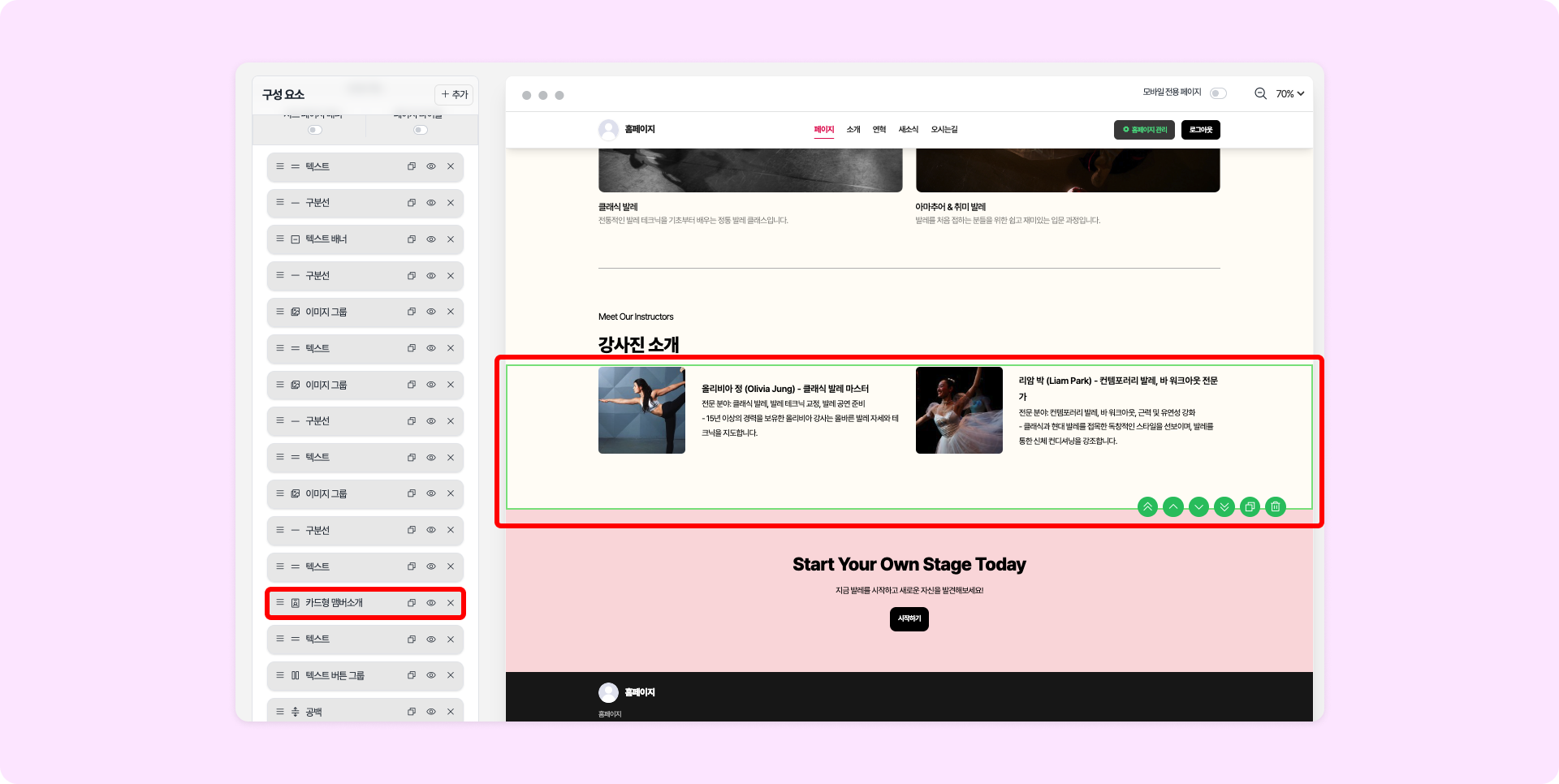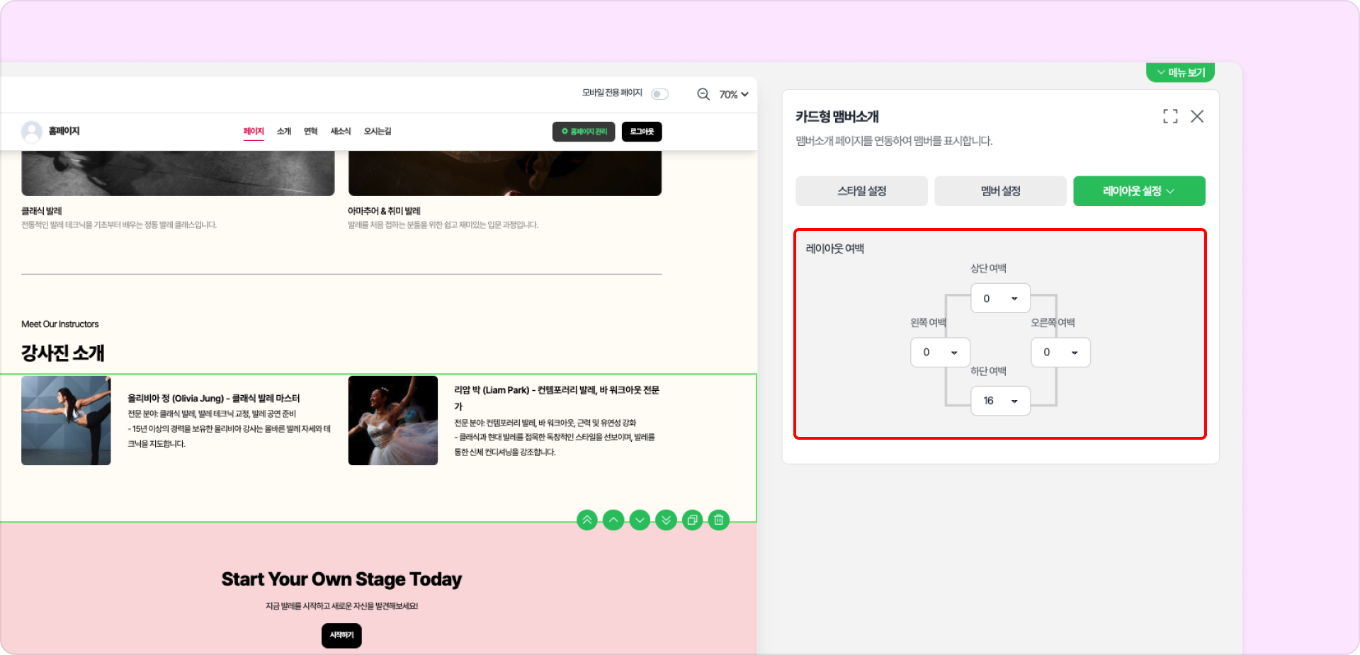 카드형 멤버 소개 구성 요소의 위, 아래, 왼쪽, 오른쪽 여백을 각각 설정할 수 있습니다.