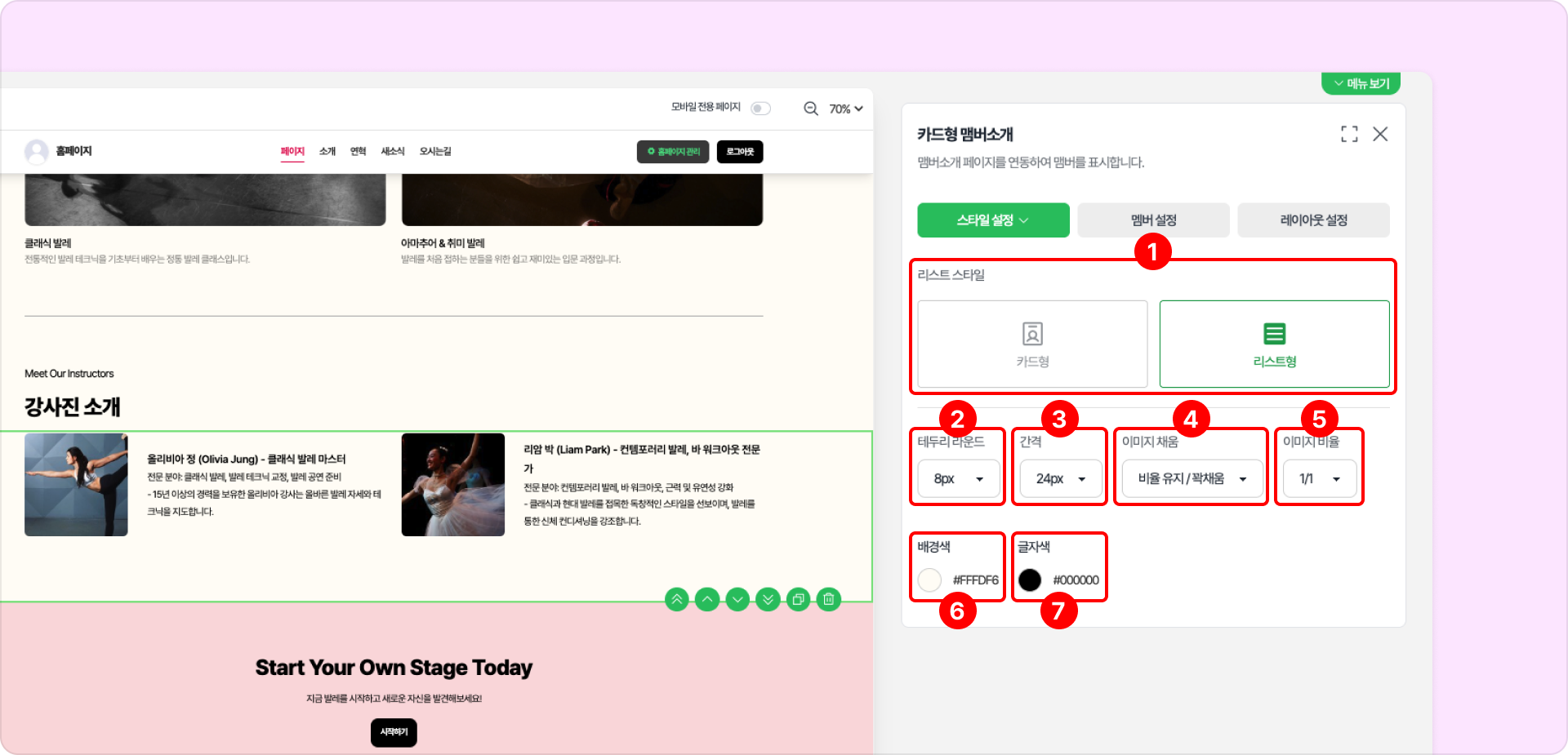 ❶ 리스트 스타일: 카드형, 리스트형으로 선택 가능합니다.