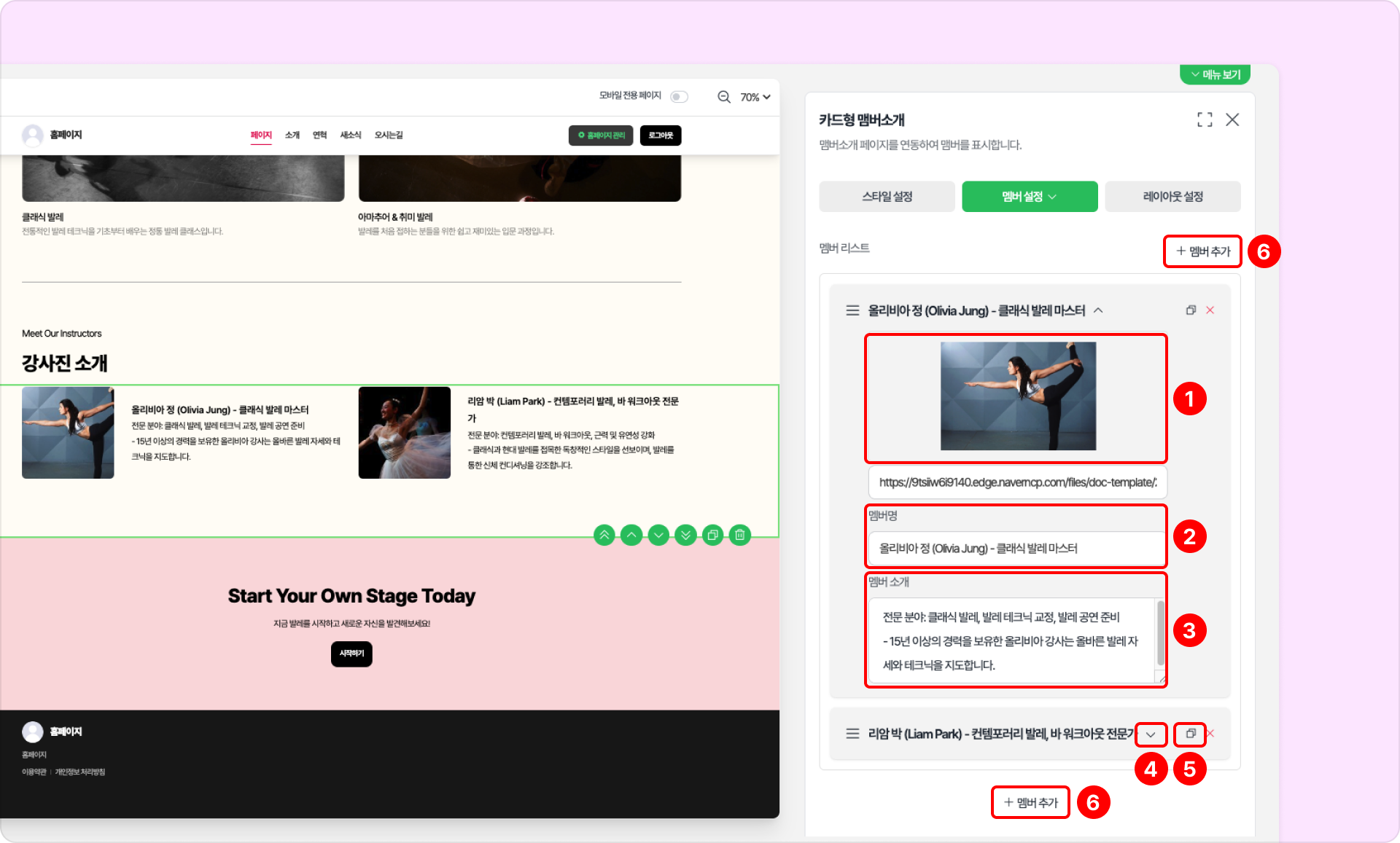 ❻ 추가: 상단 '+멤버추가' 또는 리스트 하단 '+멤버추가' 버튼을 클릭하여 더 많은 항목을 추가할 수 있습니다.