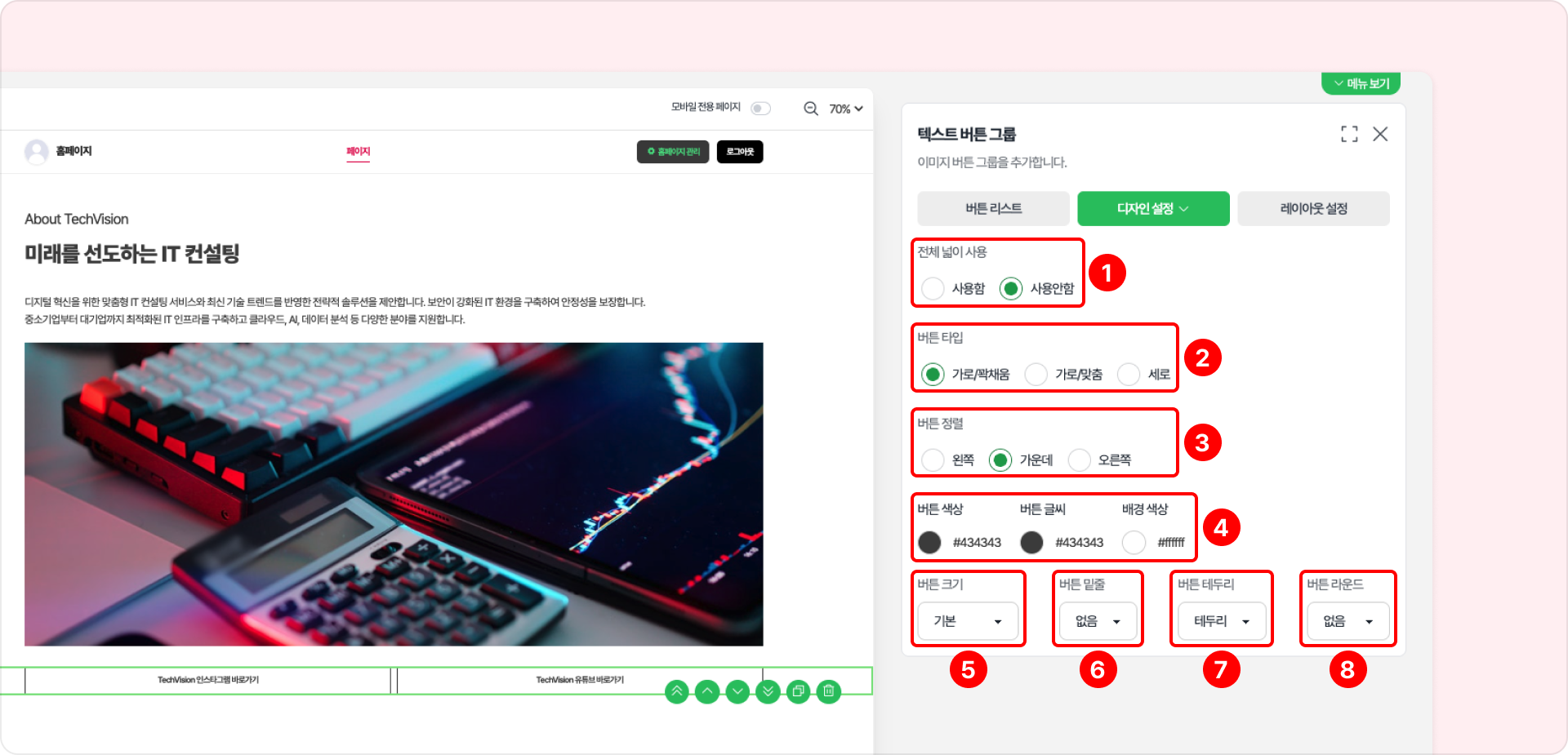 ❽ 테두리 라운드: 버튼의 테두리 라운딩을 설정합니다.