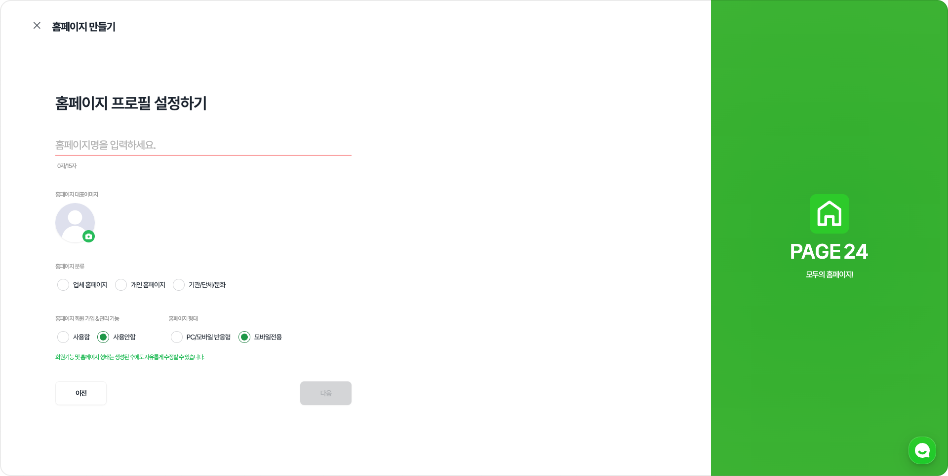 운영자 프로필 생성이 완료되었다면, 홈페이지를 추가할 수 있습니다!