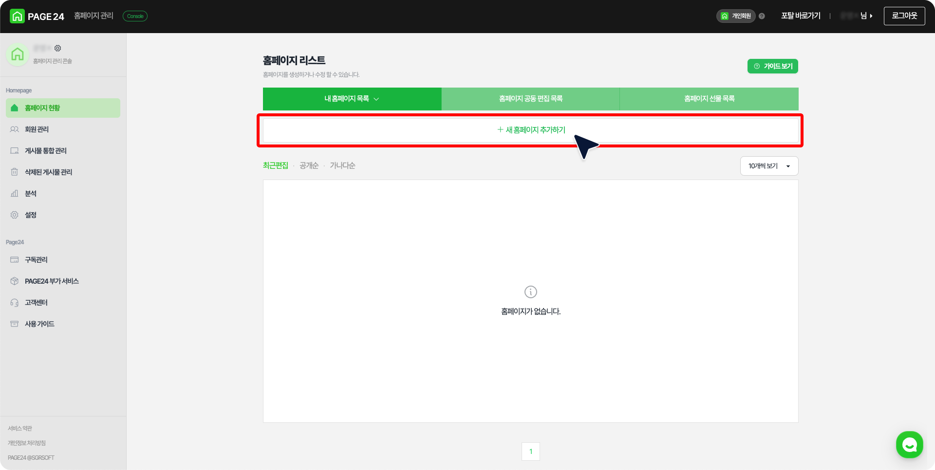 [새 홈페이지 추가하기] 버튼을 클릭하여 홈페이지 생성을 진행합니다.