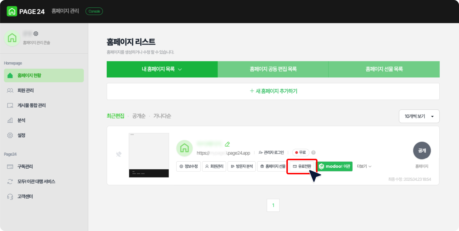 홈페이지 현황에서 [유료 전환] 버튼을 클릭해 주세요.