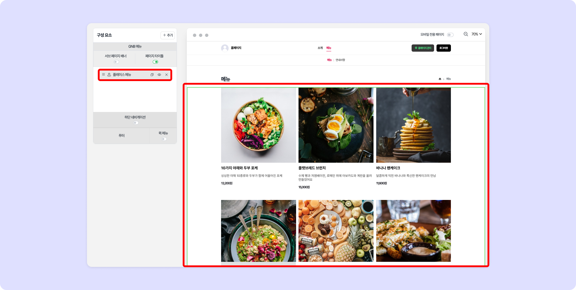 '플레이스 메뉴' 구성 요소는 플레이스에 등록된 메뉴를 불러오는 기능이기 때문에 페이지24에서는 메뉴명과 설명, 가격은 수정할 수 없습니다. 수정이 필요할 경우, 플레이스에서 수정한 뒤 [플레이스 탭 > 불러오기]를 클릭하여 다시 불러올 수 있습니다.