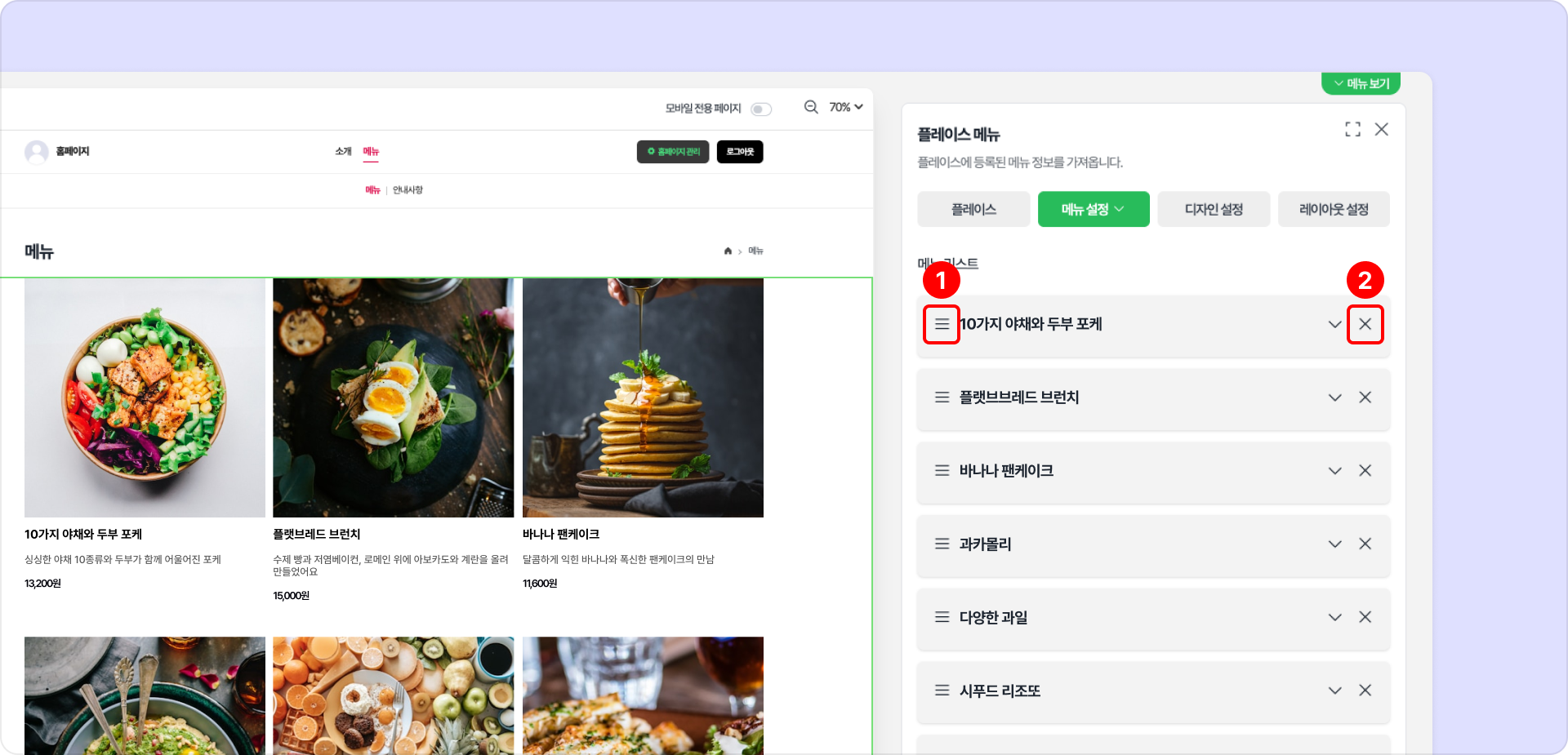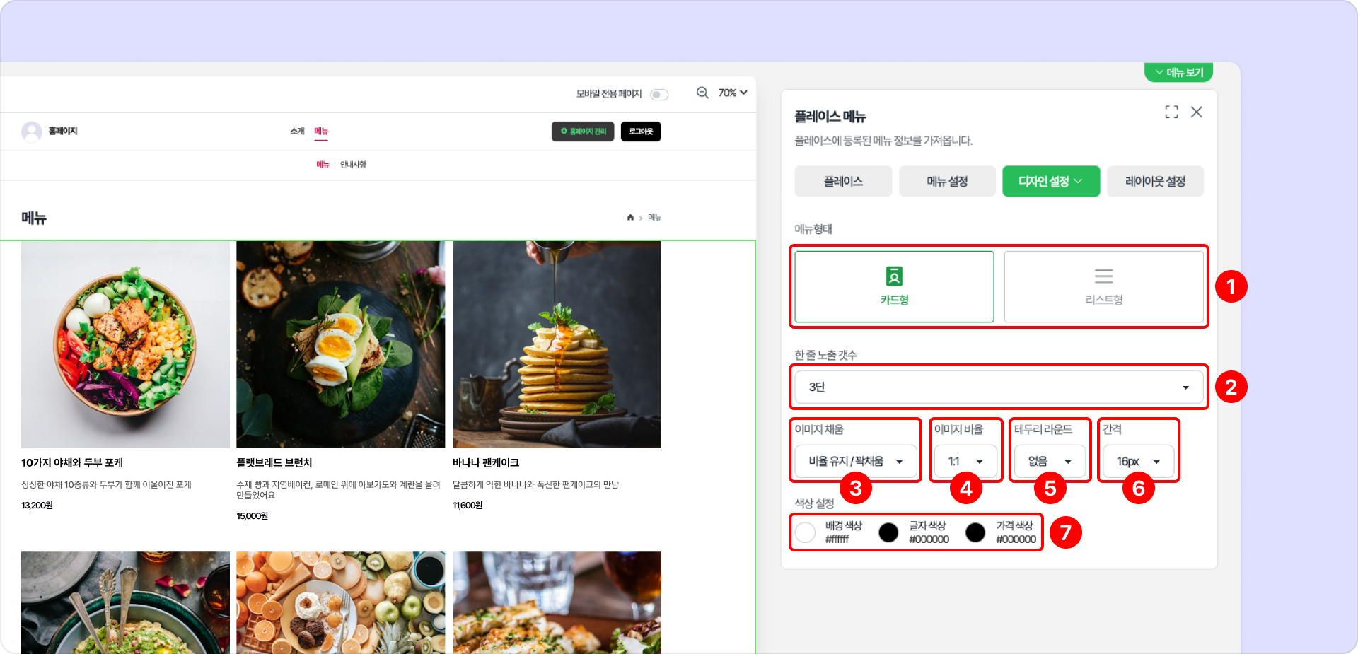 ❶ 메뉴 형태: 이미지를 중심으로 메뉴를 보여주는 '카드형'과 텍스트 중심으로 보여주는 '리스트형' 중 선택하여 사용할 수 있습니다.