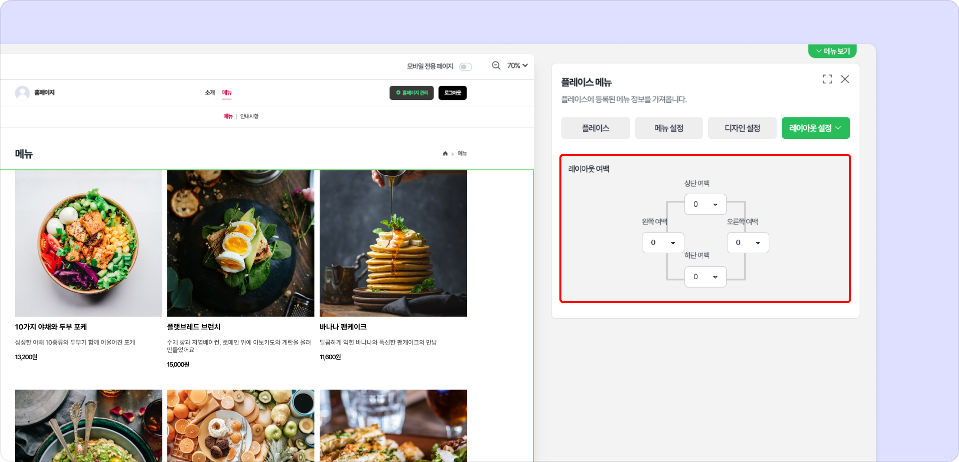 플레이스 메뉴 구성 요소의 위, 아래, 왼쪽, 오른쪽 여백을 각각 설정할 수 있습니다.