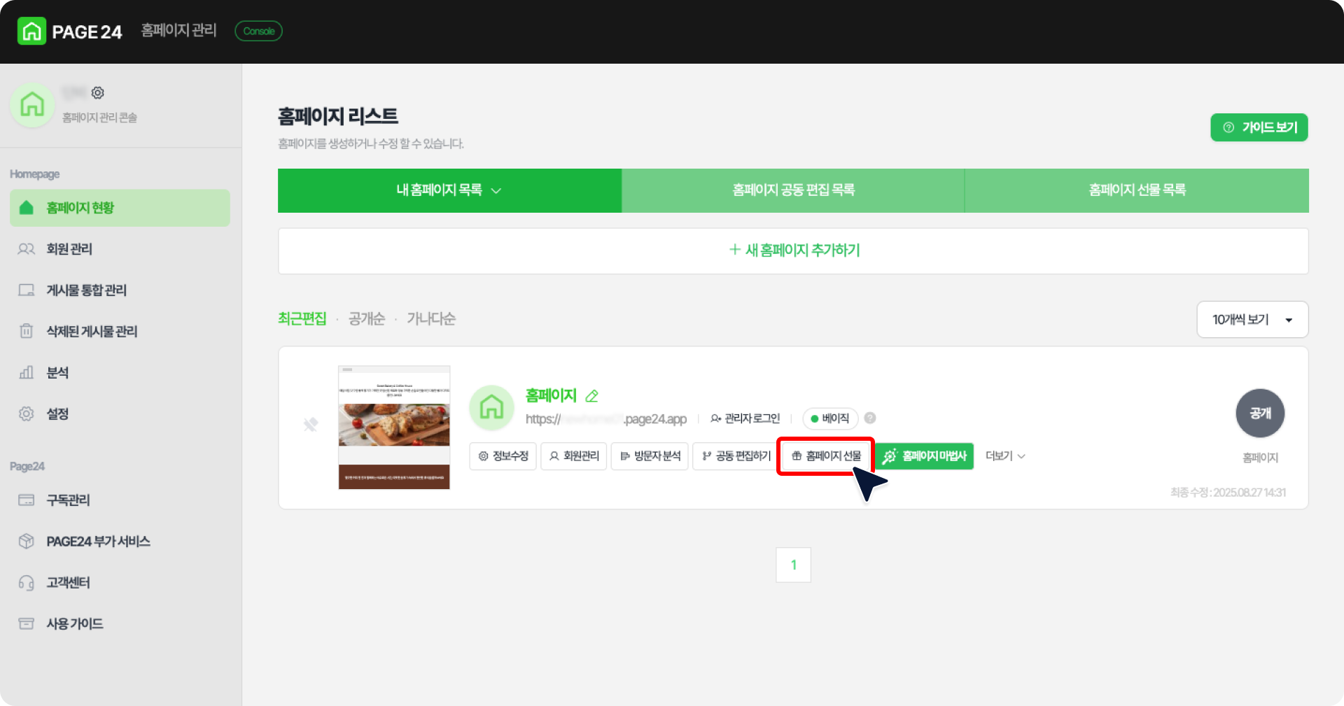 홈페이지 현황에서 [홈페이지 선물] 버튼을 클릭합니다.