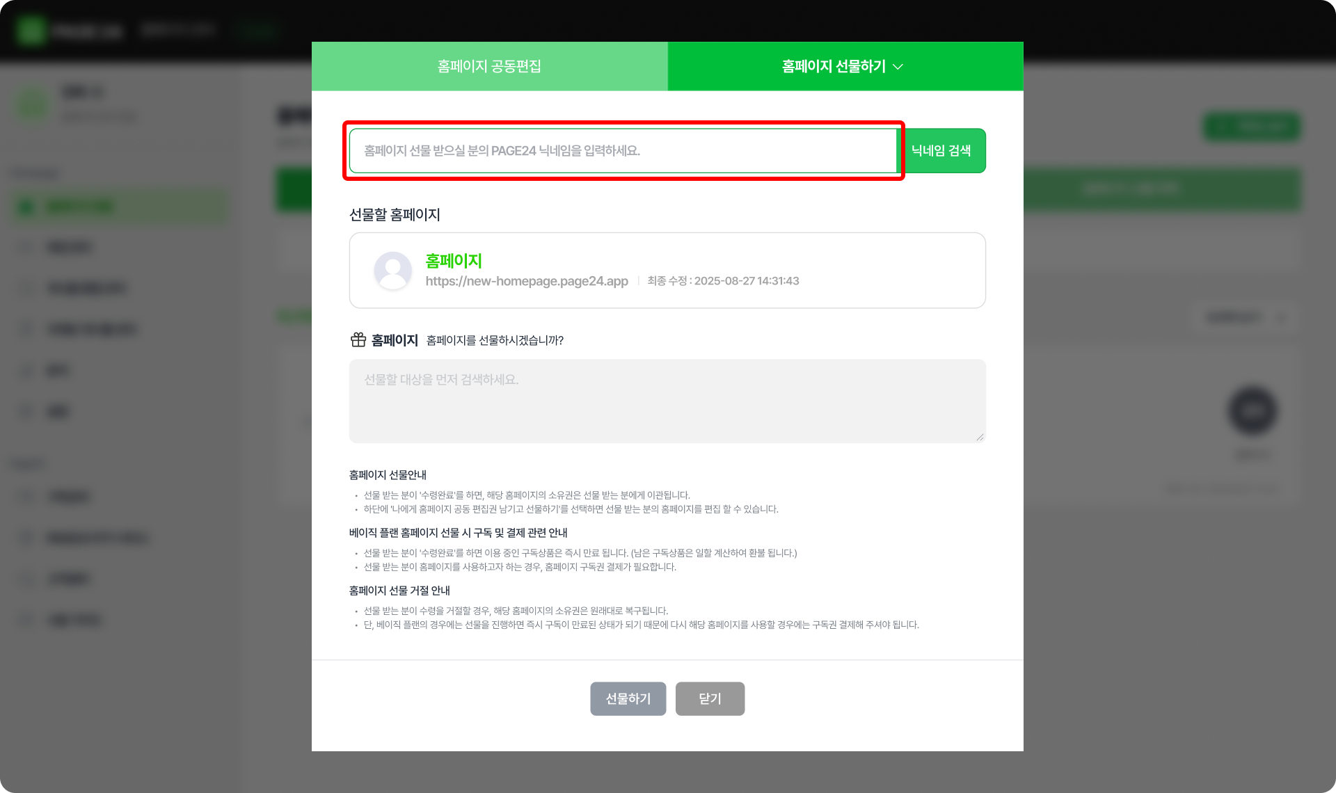 홈페이지를 선물할 페이지24 회원의 닉네임을 검색합니다.