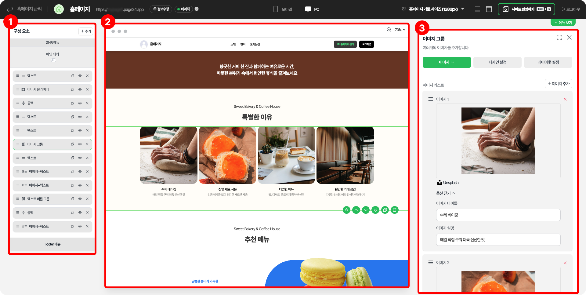 페이지의 콘텐츠를 구성하는 요소들을 관리할 수 있습니다.