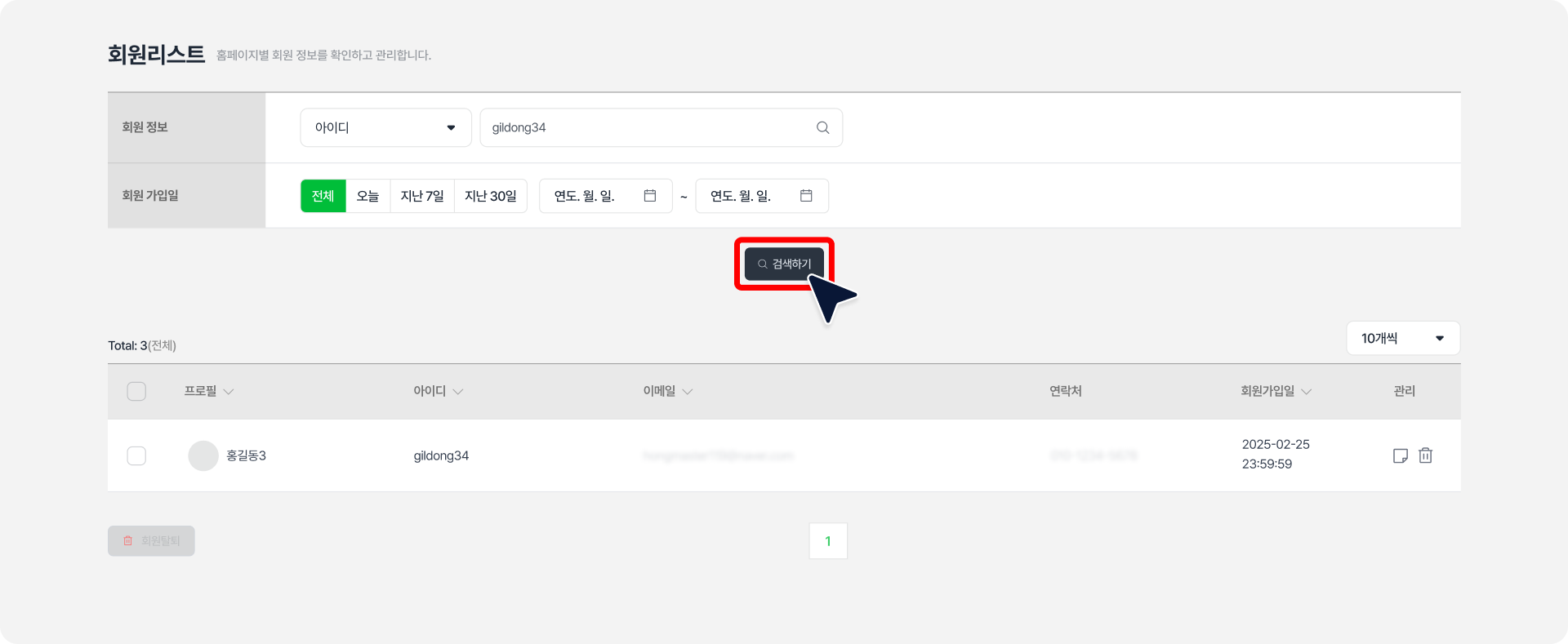 검색 필터 설정 후 [검색하기] 버튼을 클릭해야 회원 관리 리스트에 반영됩니다.