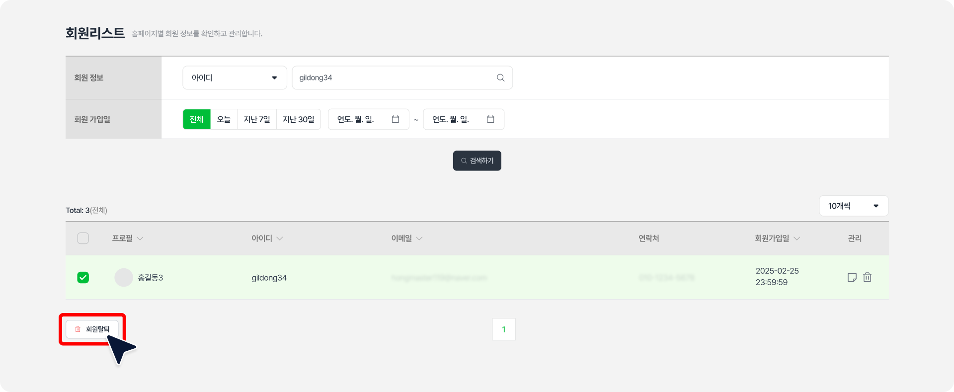 특정 회원을 선택하여 탈퇴시킬 수 있습니다. 탈퇴 처리된 회원은 회원 관리 목록에서 바로 사라지며, 삭제된 회원의 데이터는 복구 불가능하니 유의해 주세요.