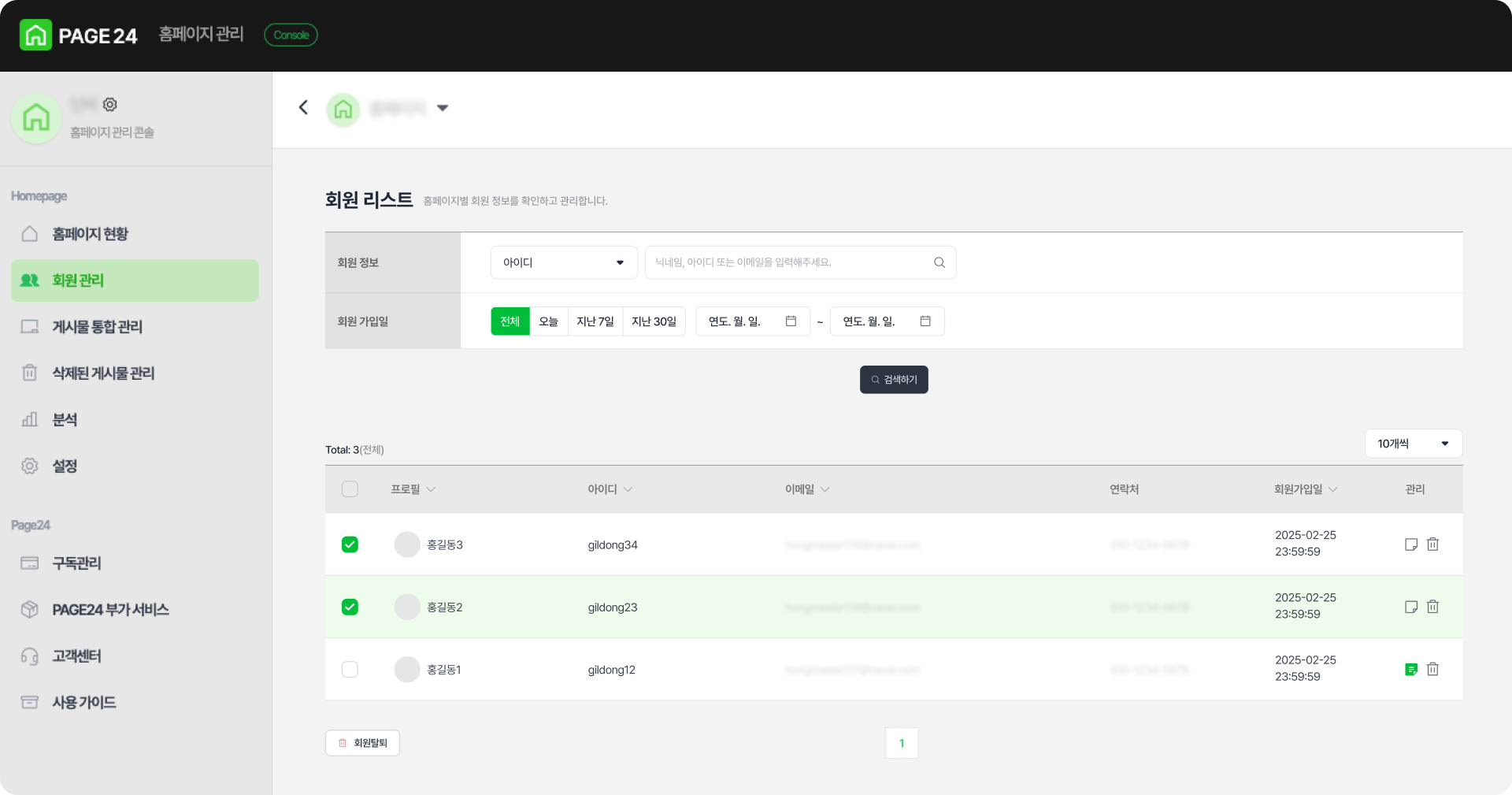 회원 관리에서는 홈페이지별로 사이트에 가입된 회원을 관리할 수 있습니다.