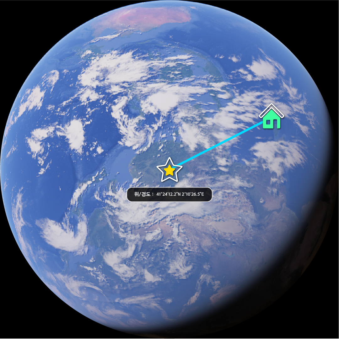 단순한 이미지 감상을 넘어, 사용자가 직접 전 세계 어떤 도시든 연결해보며 다양한 경로의 거리 차이와 비행시간을 예측해보는 능동적인 학습이 가능합니다.