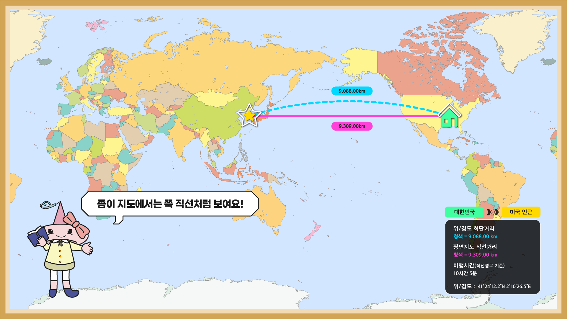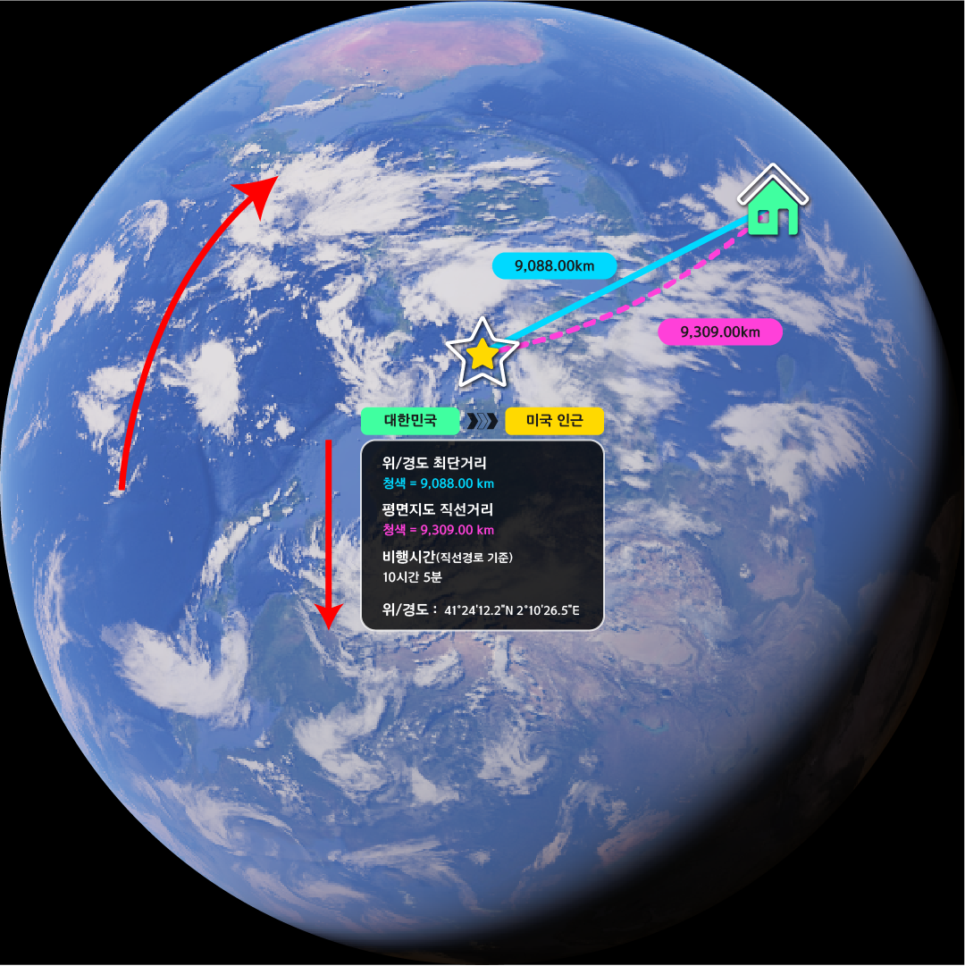 이미지 예시처럼 서울-뉴욕 간 비행 시, 지도상의 직선(9,309km)보다 북쪽으로 휘어지는 곡선 경로(9,088km)가 더 가깝다는 사실을 직관적인 수치로 확인합니다.