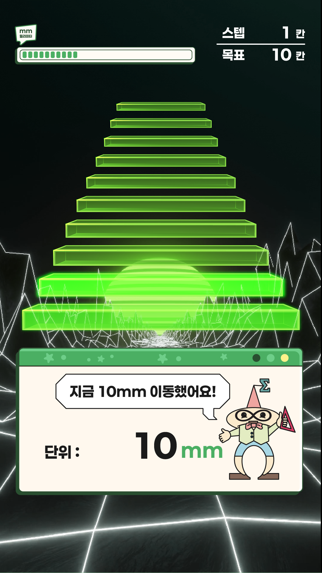 상단의 진행 바(Progress Bar)를 통해 현재 스텝과 목표(예: 1000칸) 달성률을 직관적으로 보여주어 도전 의식을 자극합니다.