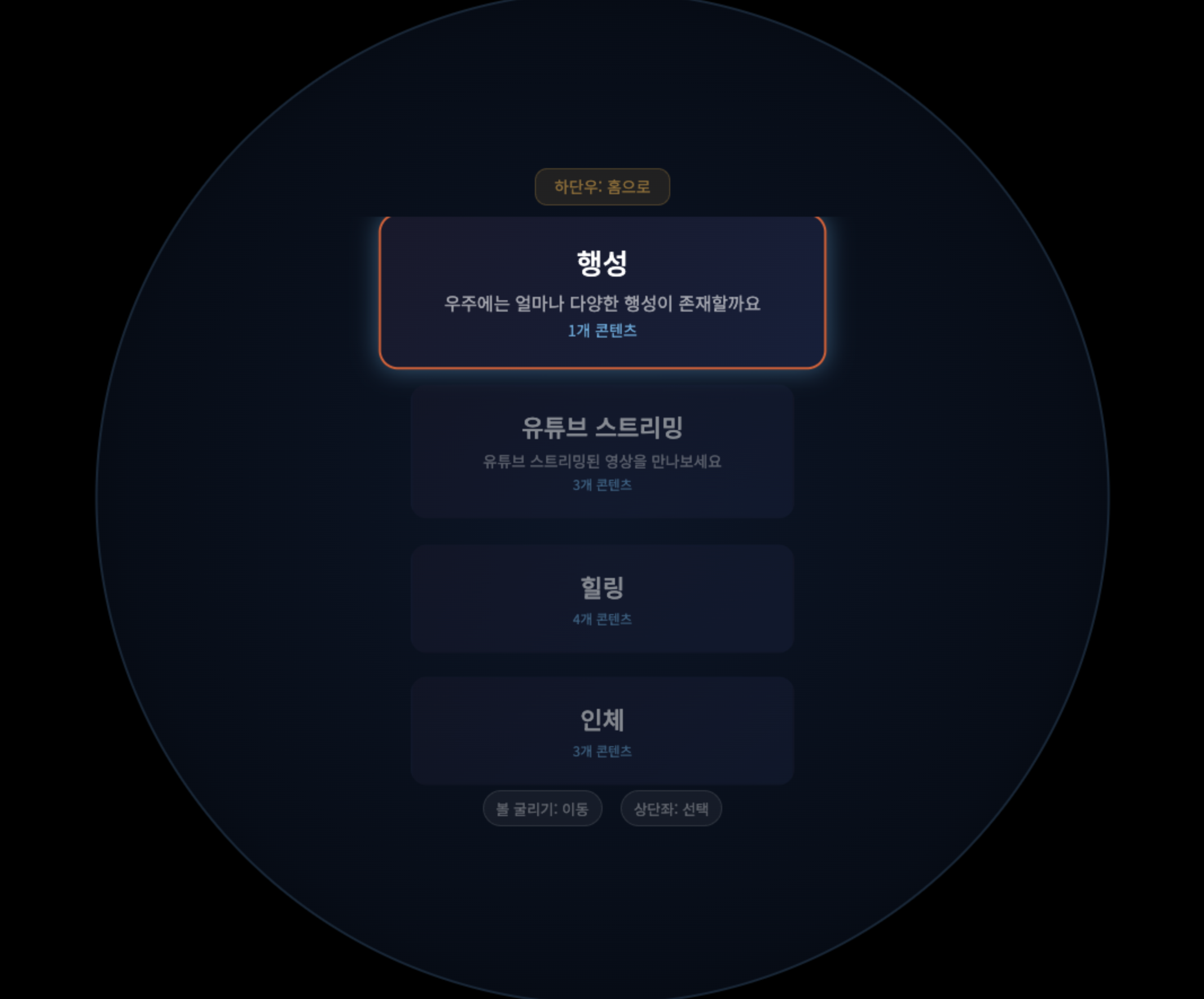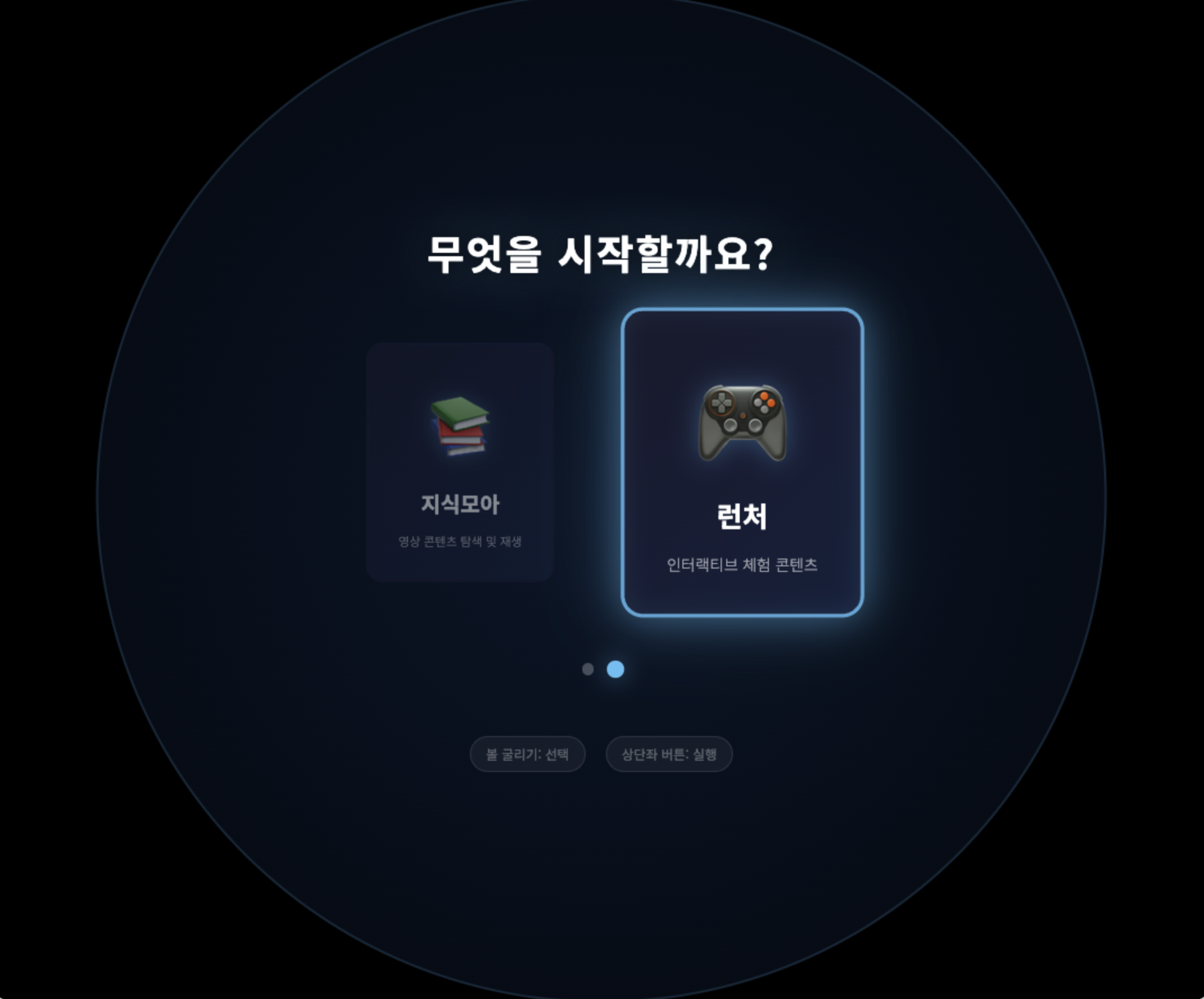 이프-SD의 통합 플랫폼은 반구형 디스플레이의 물리적 특성을 최대한 활용하도록 설계된 전용 소프트웨어 환경입니다. 홈 화면에서 지식모아와 런처 두 가지 메뉴로 진입하며, 별도의 설정 없이 트랙볼 하나로 모든 콘텐츠를 즐길 수 있습니다. 새로운 콘텐츠는 플랫폼 업데이트를 통해 지속적으로 추가됩니다.