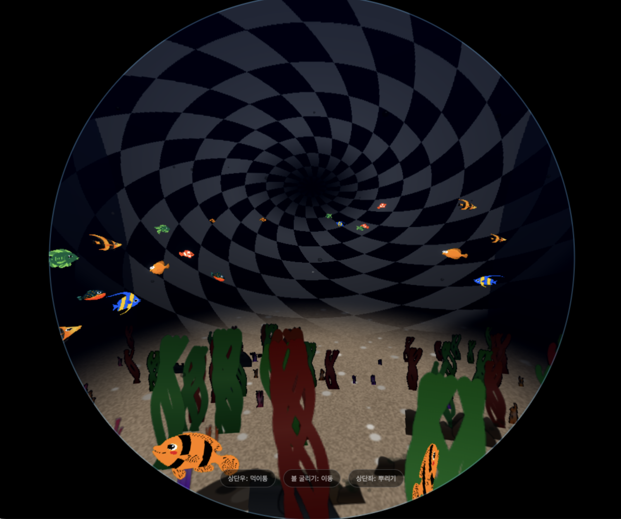 돔 위의 어항 속 물고기에게 트랙볼로 밥을 주는 인터랙티브 체험. 생동감 있는 수중 세계를 반구형으로 감상합니다.