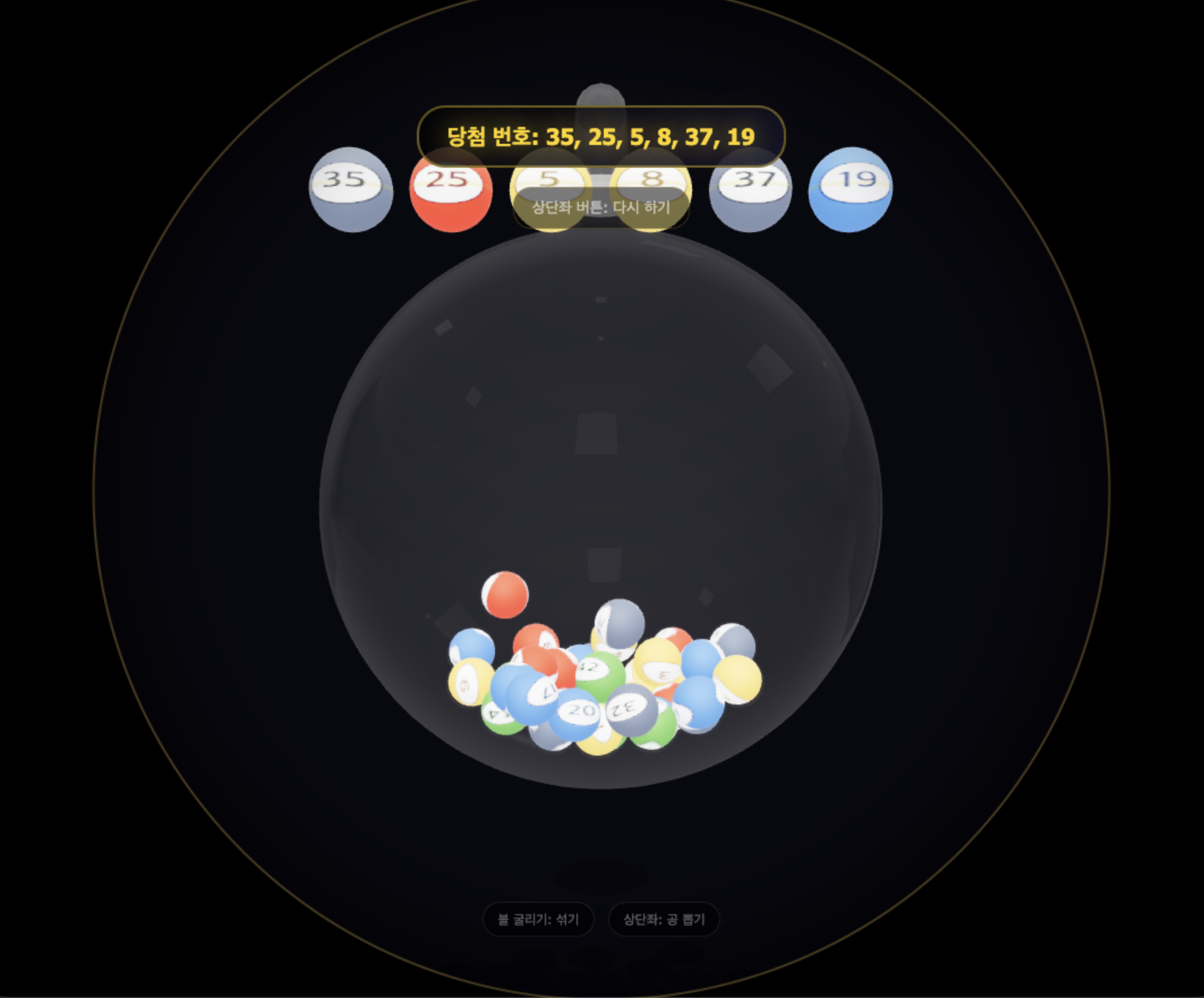 돔 안에서 공이 굴러다니며 로또 번호가 뽑힙니다. 트랙볼로 공을 굴려 6개의 번호를 완성하세요.