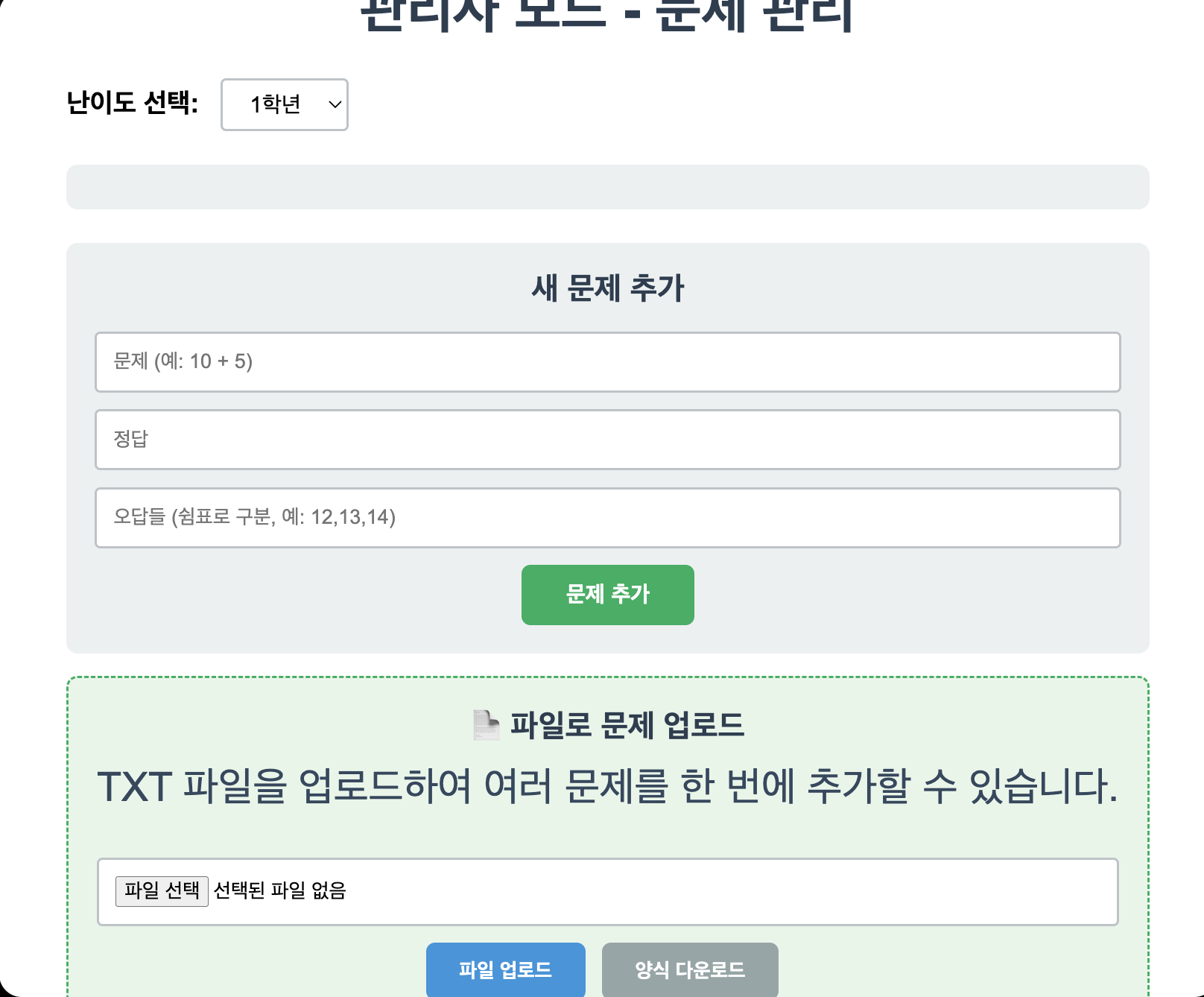 관리자 화면에서 [양식 다운로드] 버튼을 클릭하면 문제 등록을 위한 TXT 샘플 양식 파일을 다운로드할 수 있습니다.