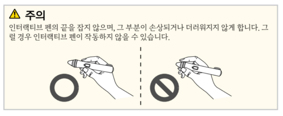 *** 주의사항: 인터렉티브 펜의 끝을 잡지 않으며, 그 부분이 손상되거나 더러워지지 않게 합니다. 그럴 경우 인터렉티브 펜이 작동하지 않을 수 있습니다.