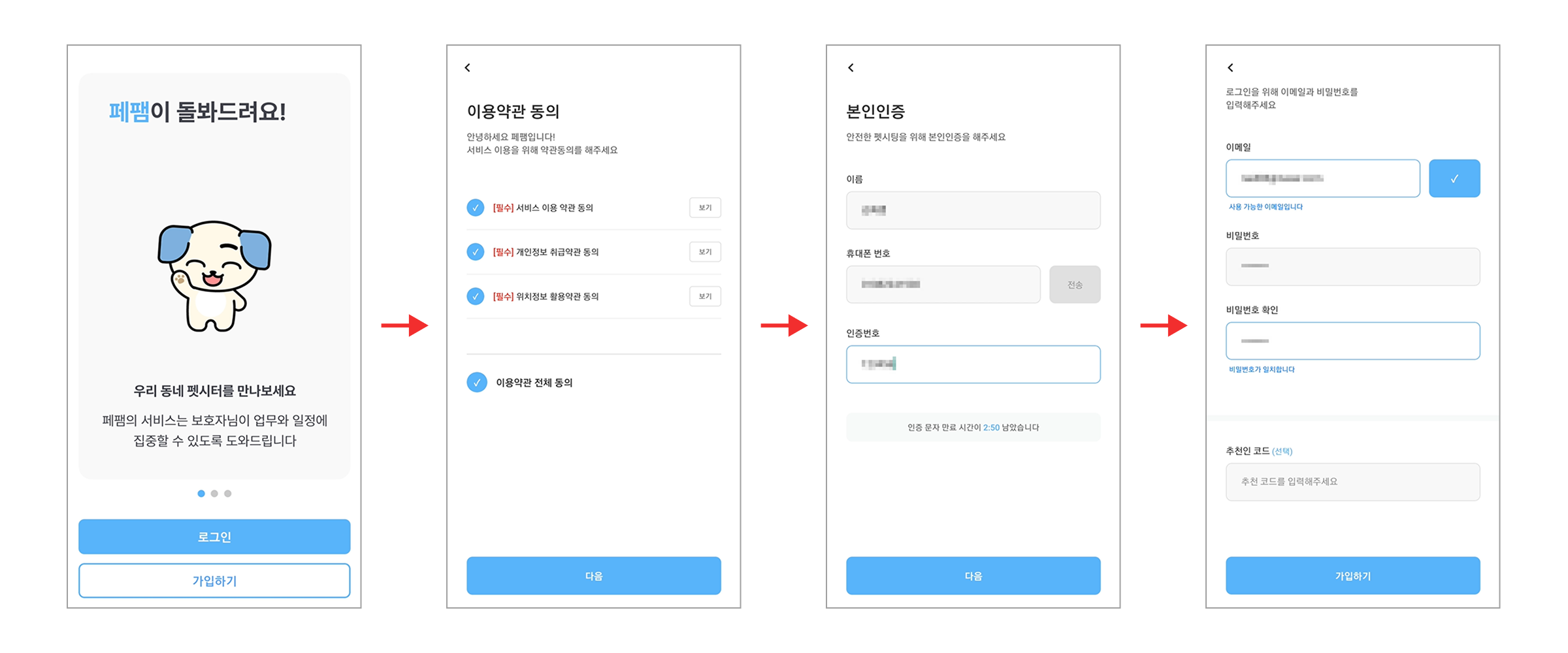 간소화된 회원가입 방식으로 페팸 서비스를 빠르게 만나볼 수 있어요.