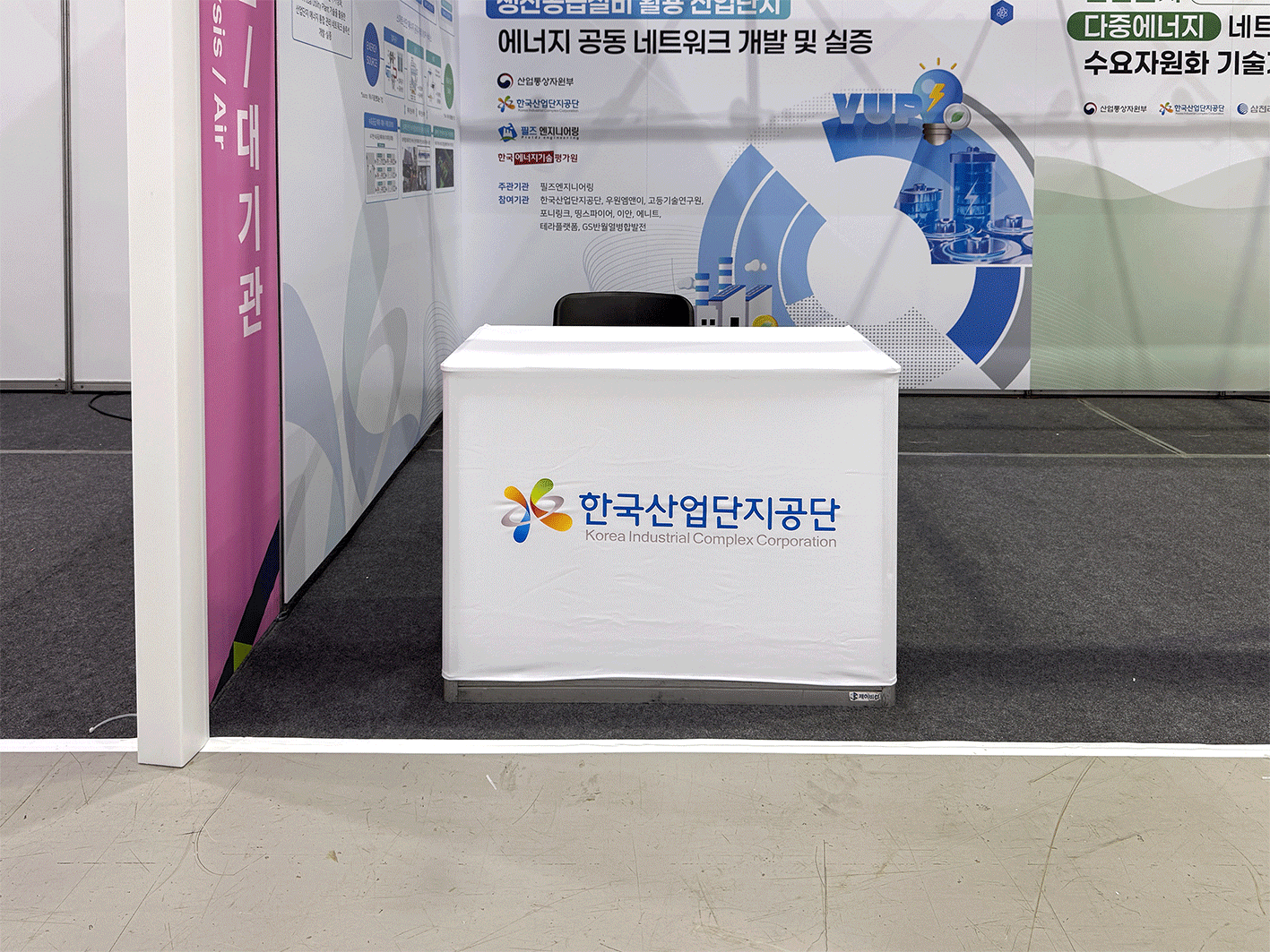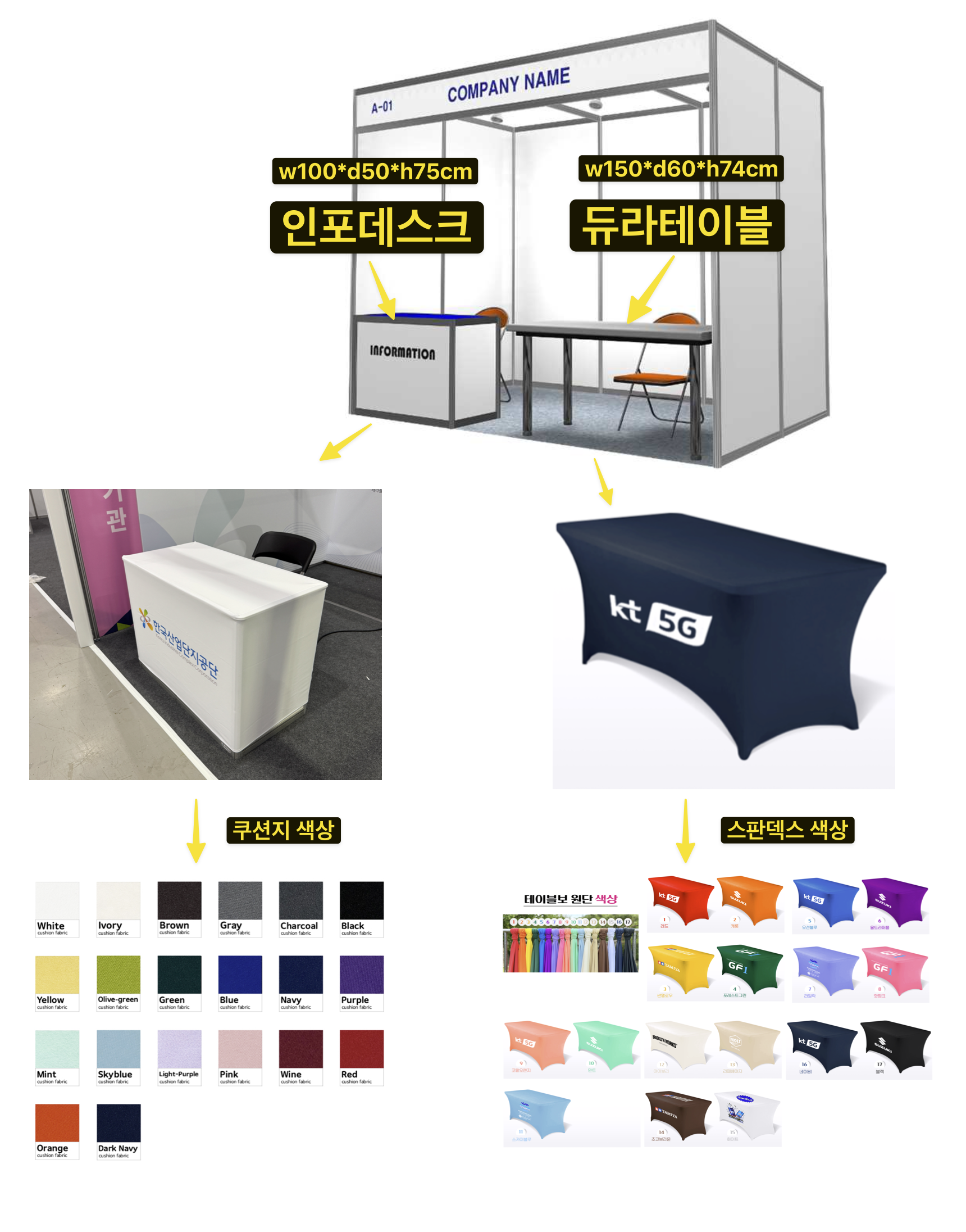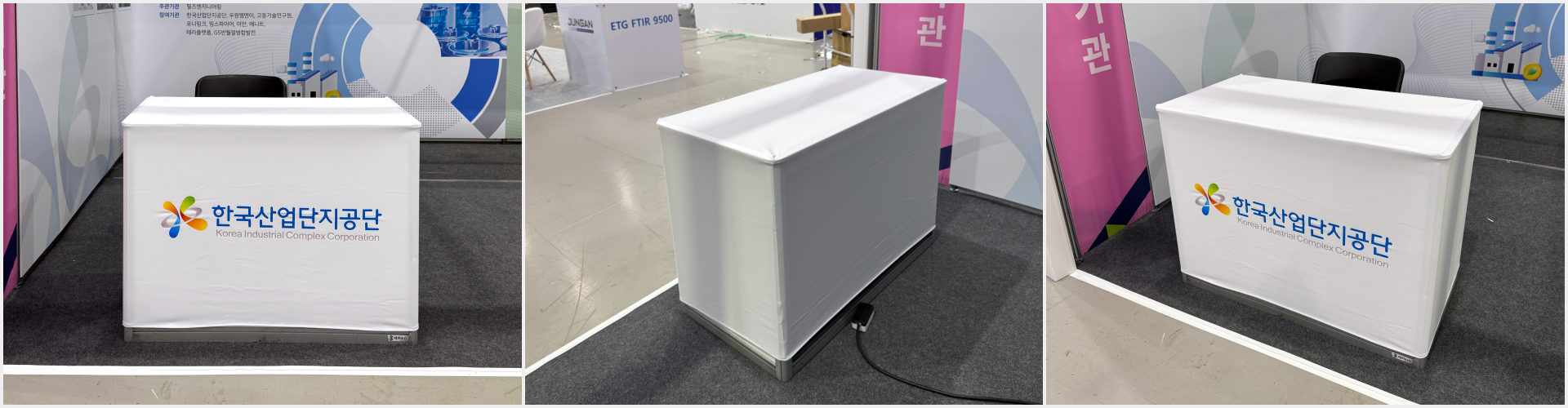 기본 인포데스크는 밋밋해서 기업의 아이덴티티를 홍보하기 위해서는 시트지, 테이블보 등을 활용해 적극적으로 활용하는게 좋습니다.