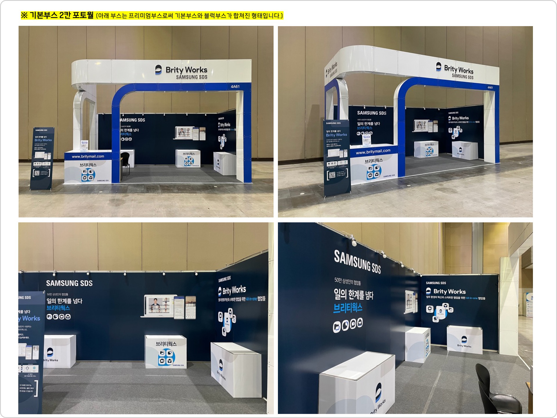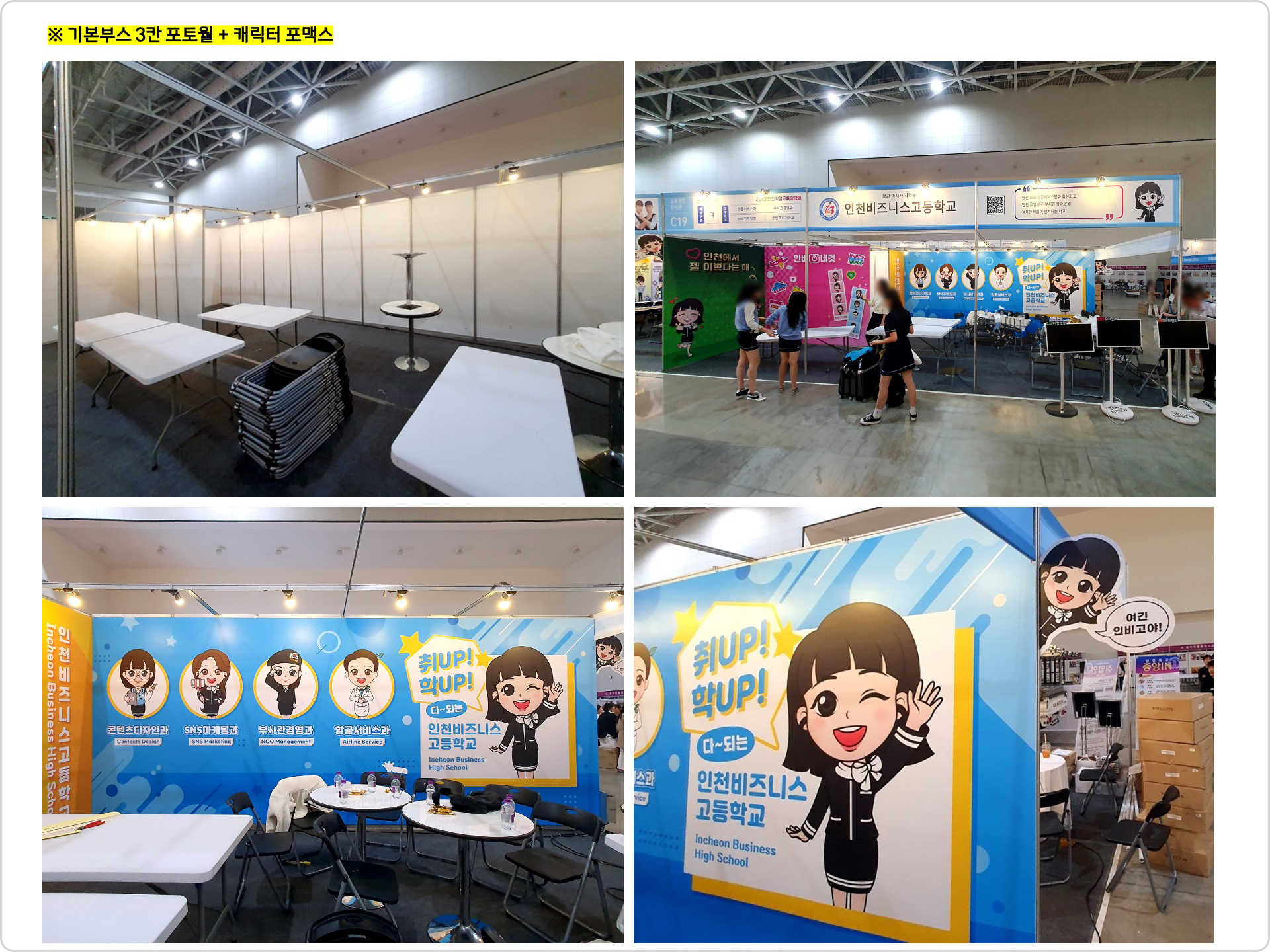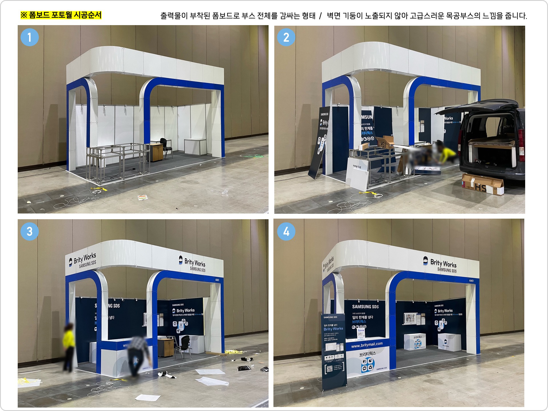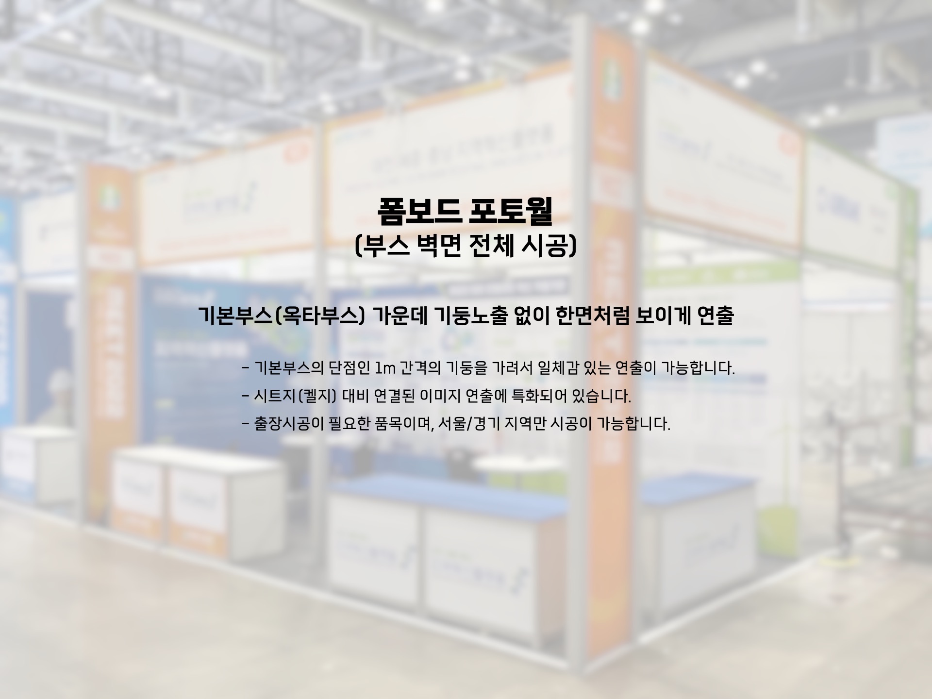 폼보드에 고급 시트지를 합지해서 기본 부스를 목공 부스처럼 꾸며주는 방식으로 기둥이 노출되지 않고 일체형으로 연출할 수 있습니다.