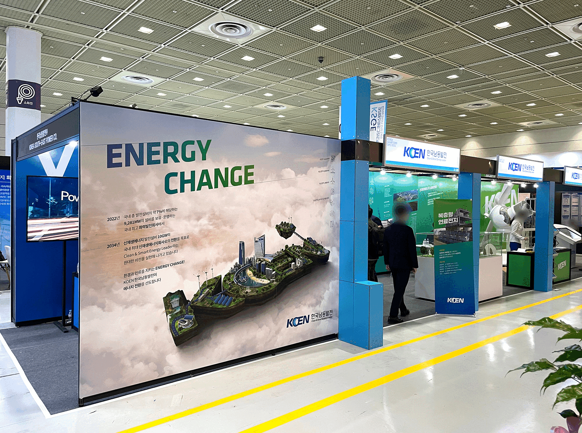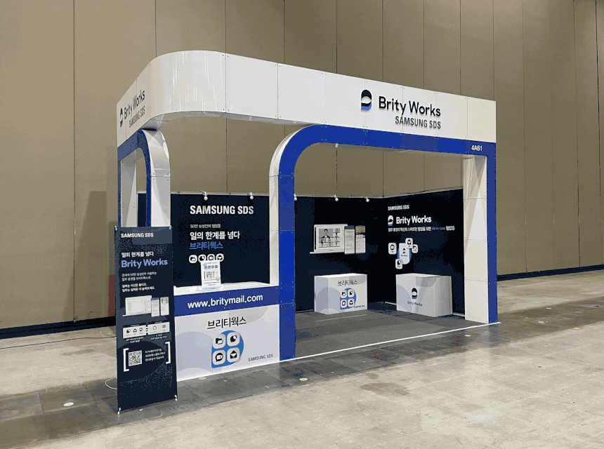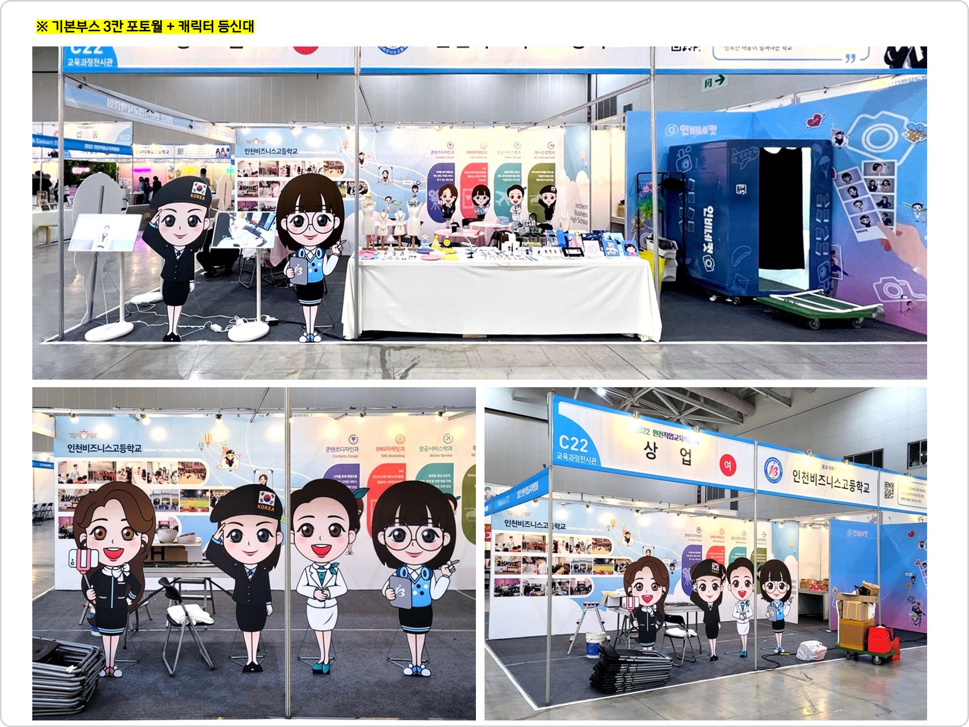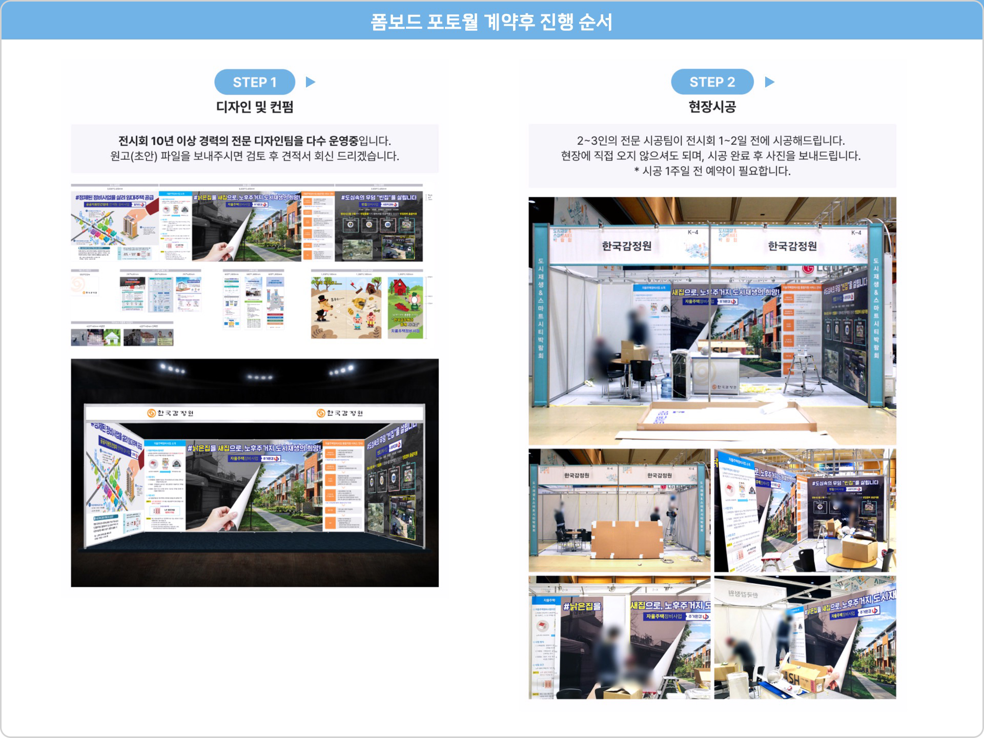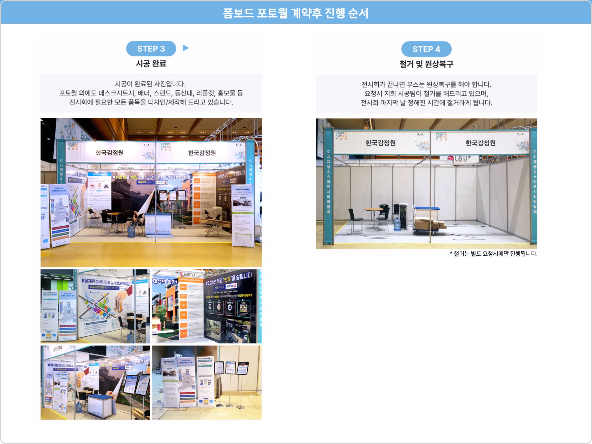 폼보드에 고급 시트지를 합지해서 기본 부스를 목공 부스처럼 꾸며주는 방식으로 기둥이 노출되지 않고 일체형으로 연출할 수 있습니다.