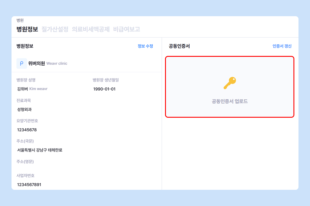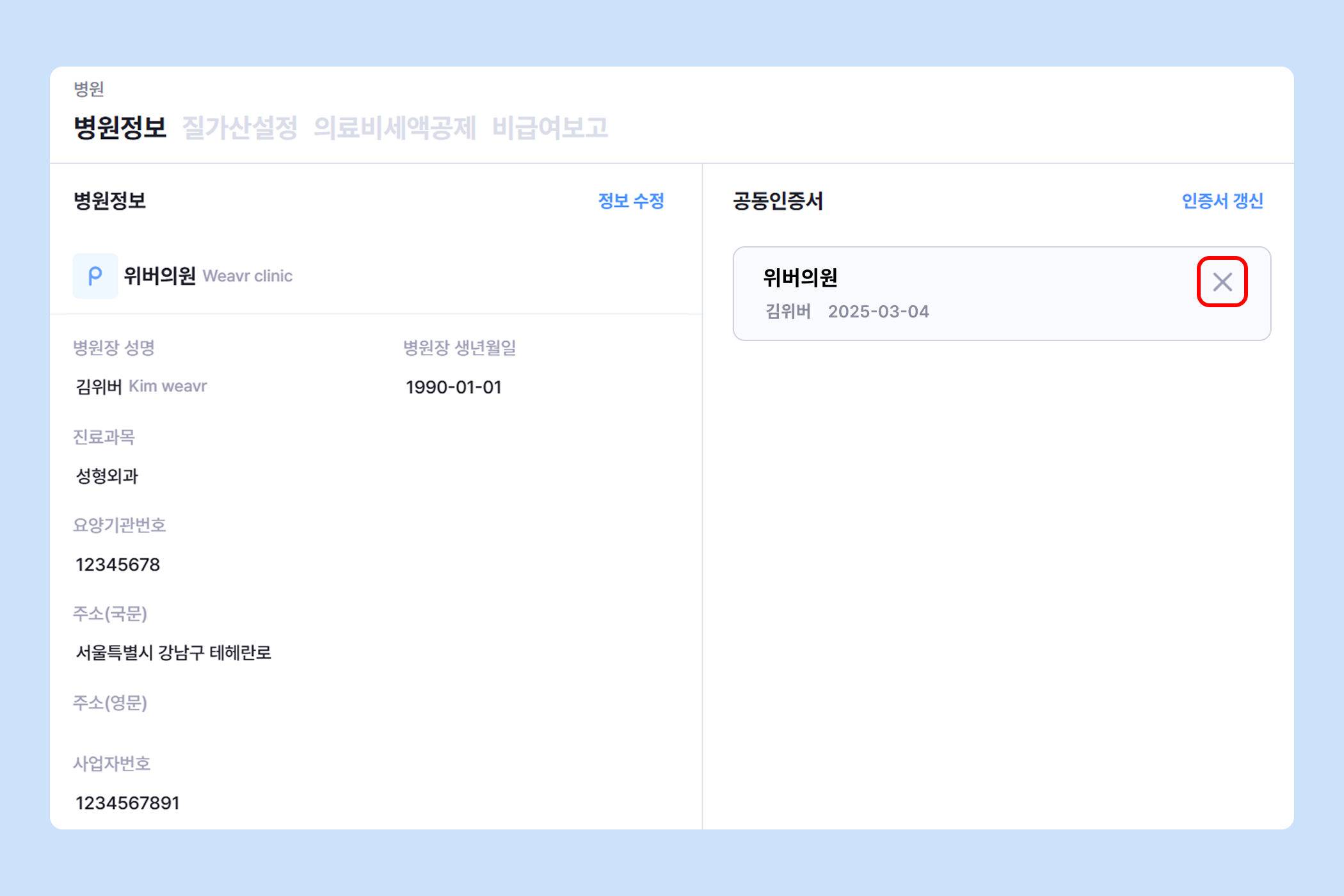 [관리 > 병원 > 병원정보] 페이지에서 등록되어있는 공동인증서에 커서를 올려 삭제해 주세요.