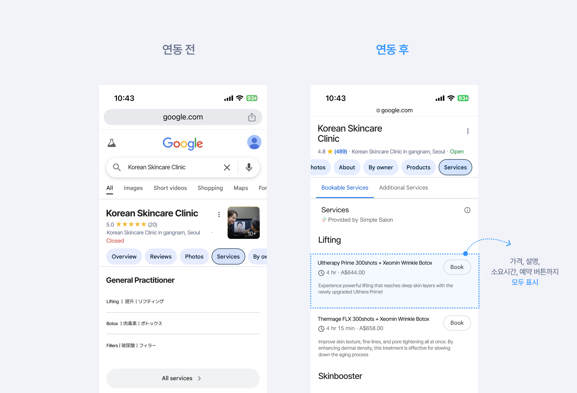 네이버 예약처럼, 구글에서도 병원의 진료 서비스와 패키지 정보를 노출하고 원클릭으로 예약을 유도할 수 있습니다.