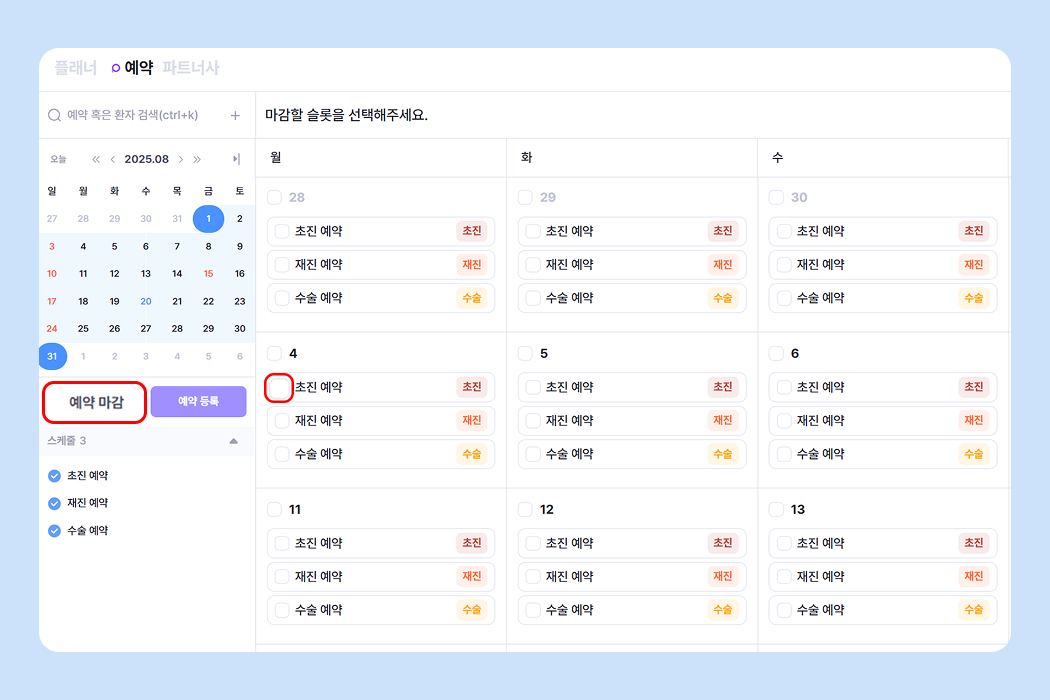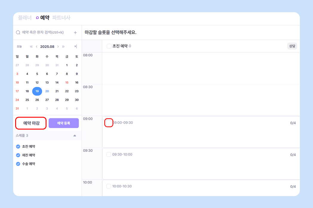 달력 아래의 '예약 마감' 버튼 클릭 후, 마감을 원하는 시간 체크박스 클릭 > 우측 상단의 '예약 마감' 버튼을 눌러 예약 마감을 진행해 주세요.