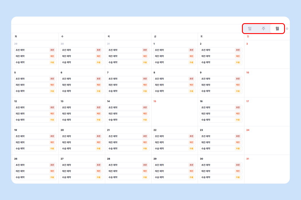[플래너 > 예약] 페이지에서 우측 상단의 뷰를 '월' 뷰로 변경해 주세요.