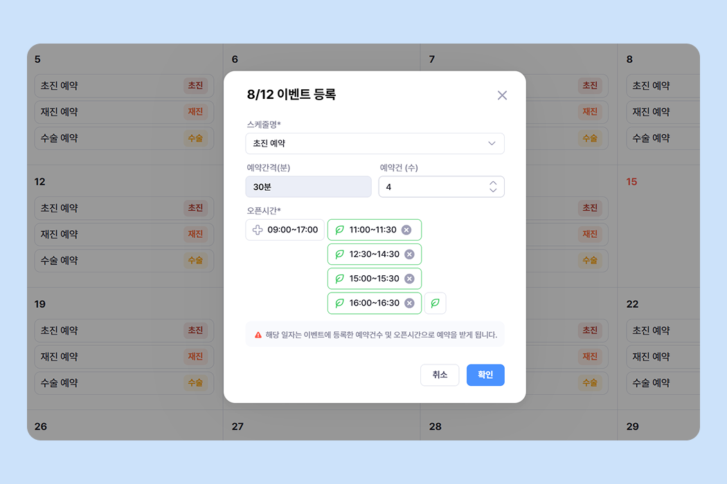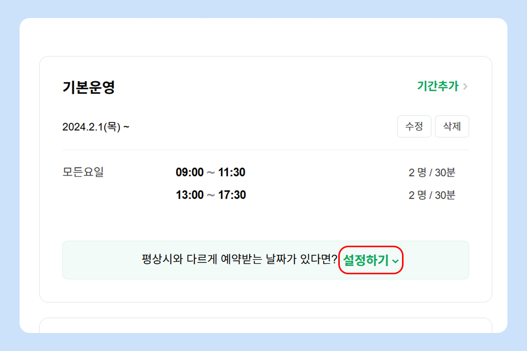이벤트 등록 기능을 통해서 특정일만 운영시간을 변경할 수 있어요.