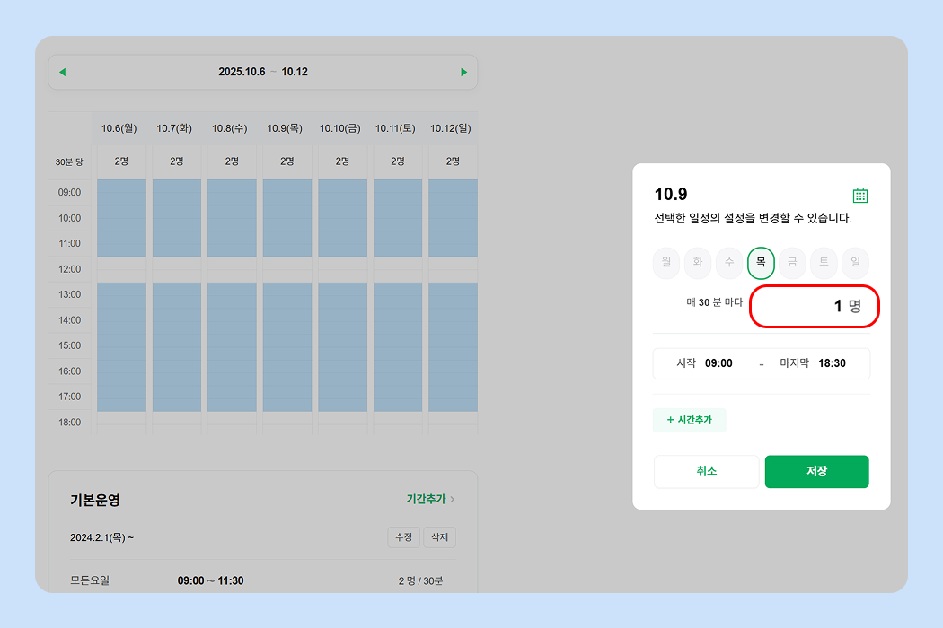 ✅ 당일 추가가 필요한 시간만 넣는 게 아닌, 그 날의 전체 운영시간을 입력해야 해요.
