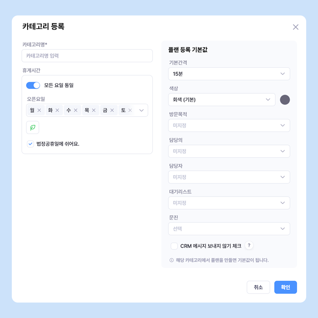 [플래너 > 플래너] 페이지에서 우측 상단 톱니바퀴 버튼을 통해 카테고리를 등록해 주세요.