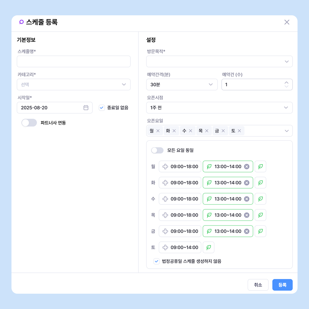 [플래너 > 예약] 페이지에서 우측 상단 톱니바퀴 버튼을 통해 스케줄을 등록해 주세요.