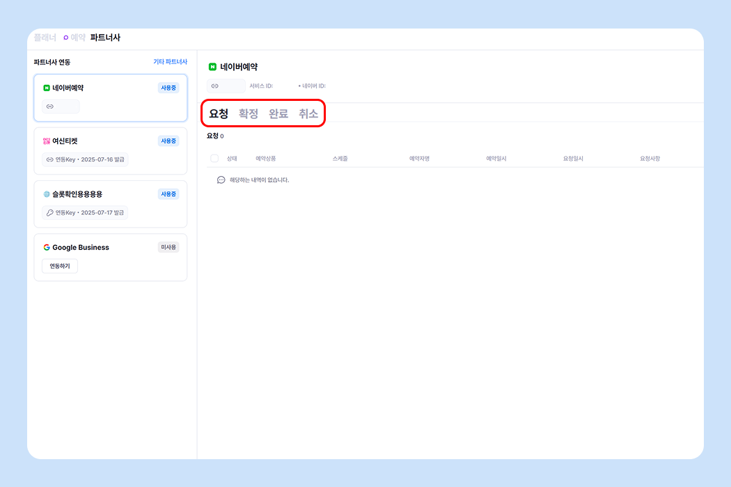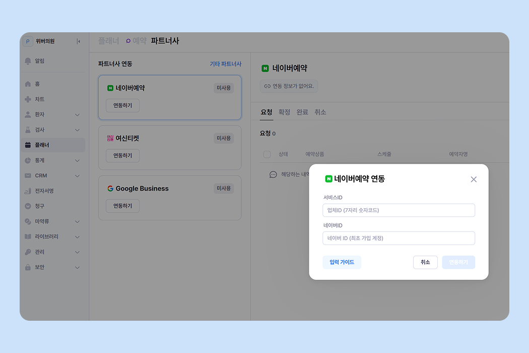 [플래너 > 파트너사] 페이지에서 네이버예약 '연동하기' 버튼을 눌러 연동을 진행해 주세요.