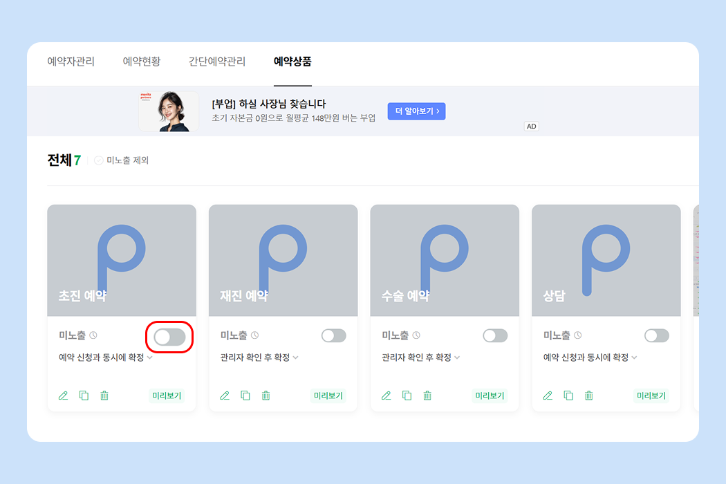 스마트플레이스에서 미노출 중이던 예약상품을 노출중으로 변경해 주세요.
