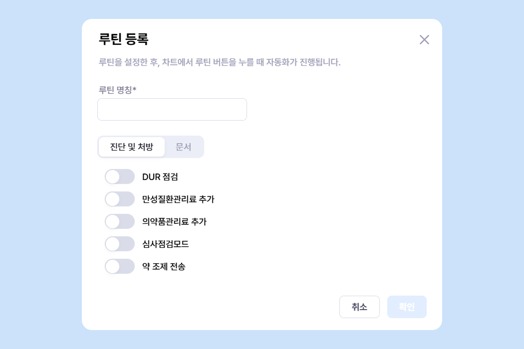 루틴은 진단 및 처방 / 문서 두가지로 분류되어 있어요.