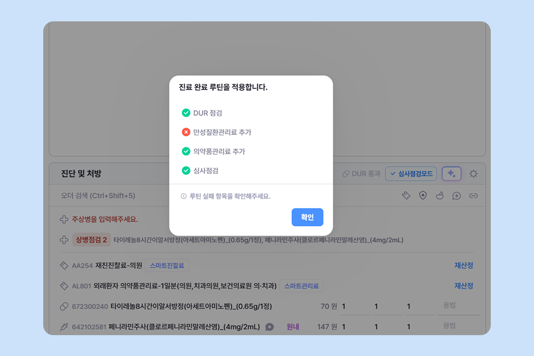 진료 후 루틴 버튼을 사용하면 처방 마무리 등 점검을 한 번에 진행할 수 있어요.