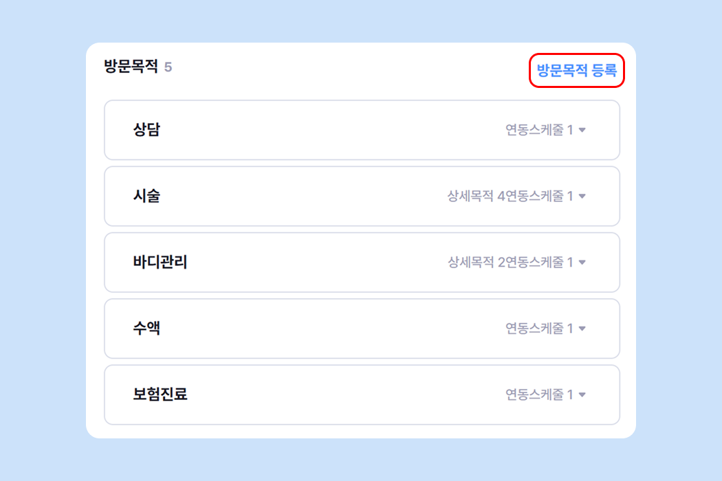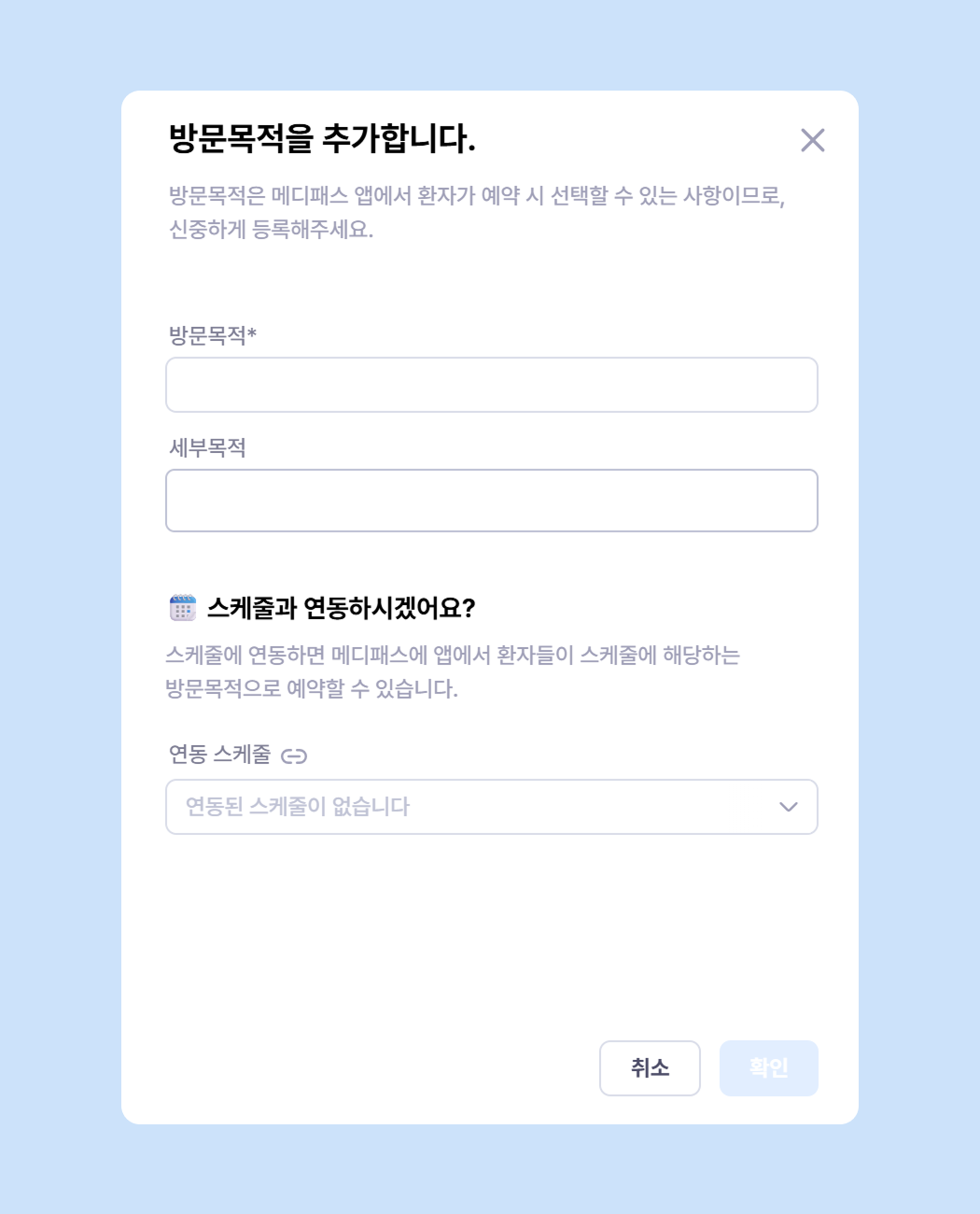 ✅ 방문목적을 예약 스케줄과 연결하면 메디패스로 예약 시 환자가 직접 선택할 수 있어요.