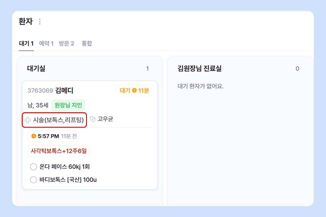 대기리스트에서 환자 방문목적을 확인할 수 있어요.